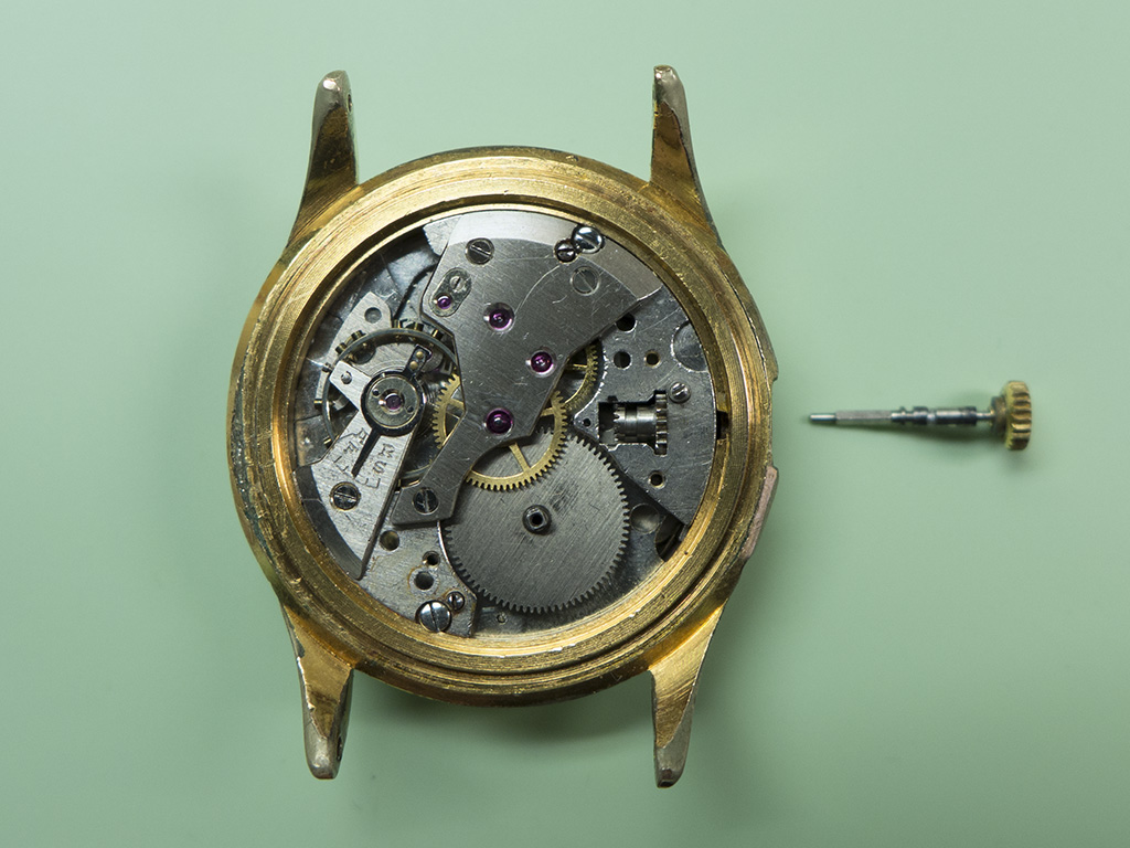 As you can see this gives you access to the clutch and winding pinion. Undo the set lever screw about one and a half turns and remove the stem, you can then remove the clutch and relocate the yoke to the correct position into the groove on the clutch. Re-assemble lubricating as you go.