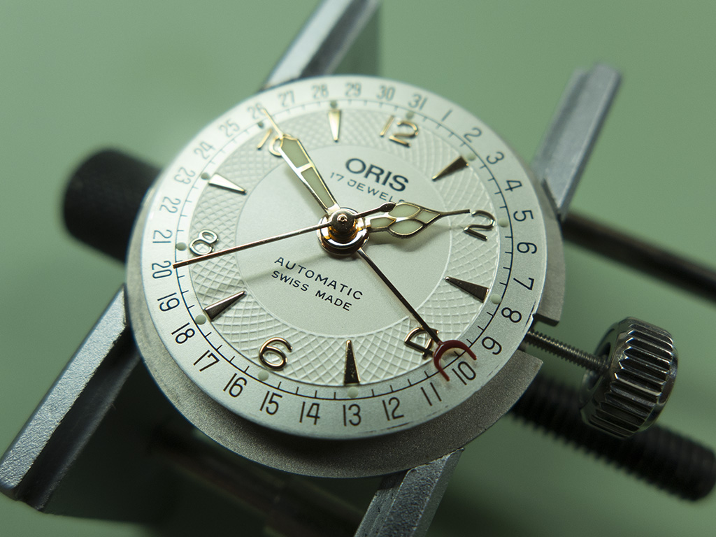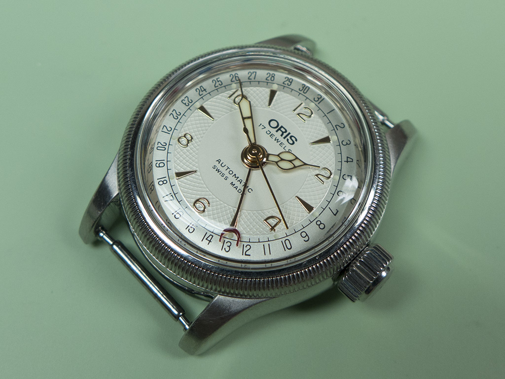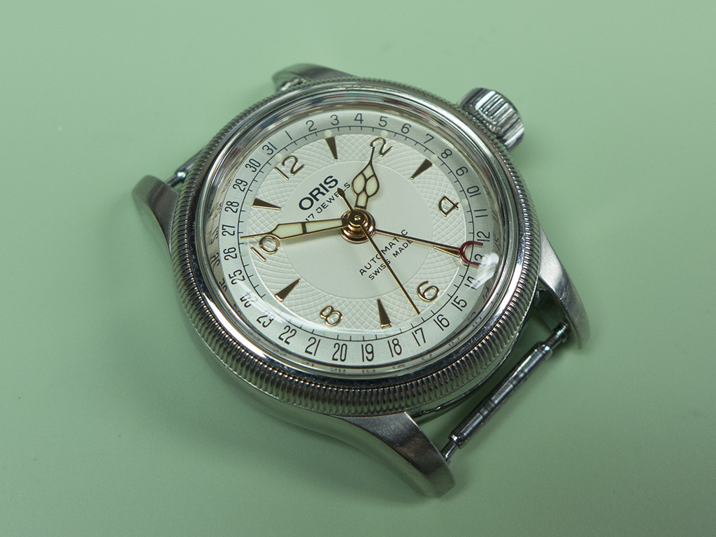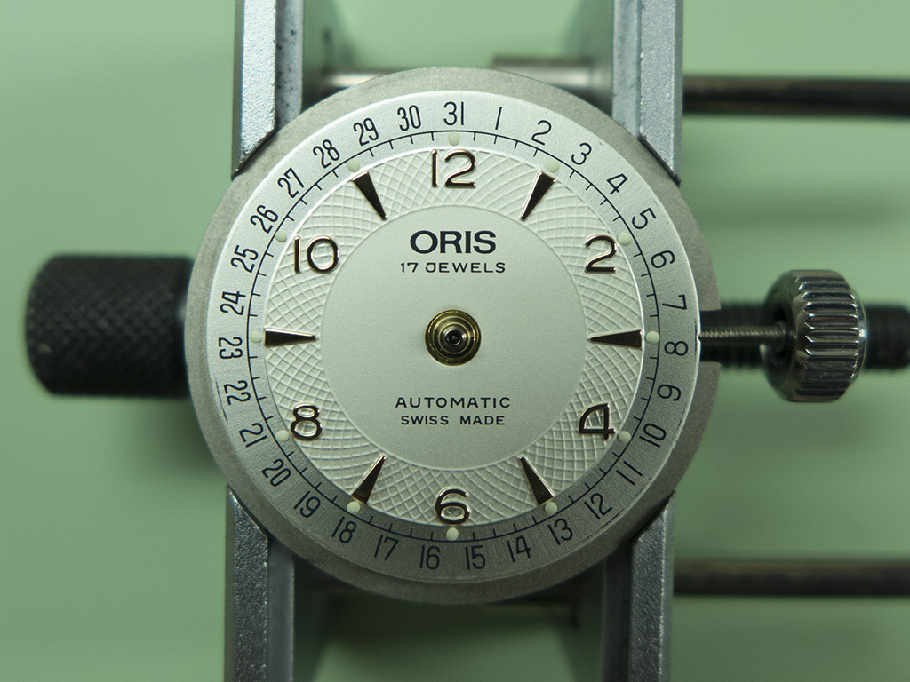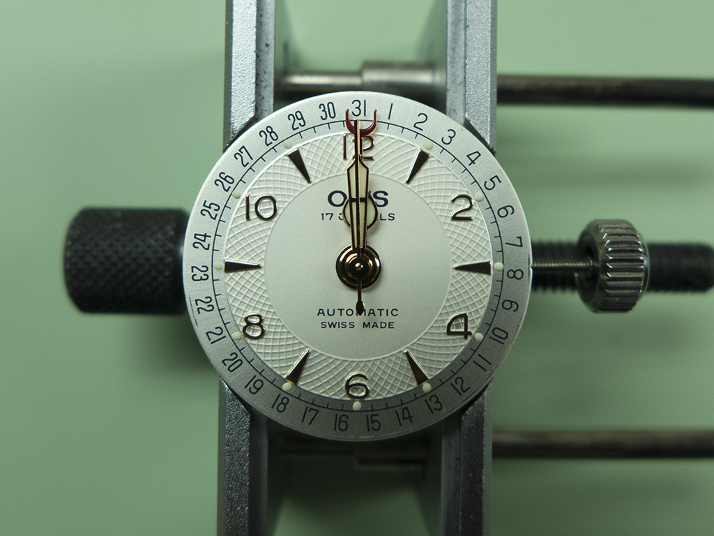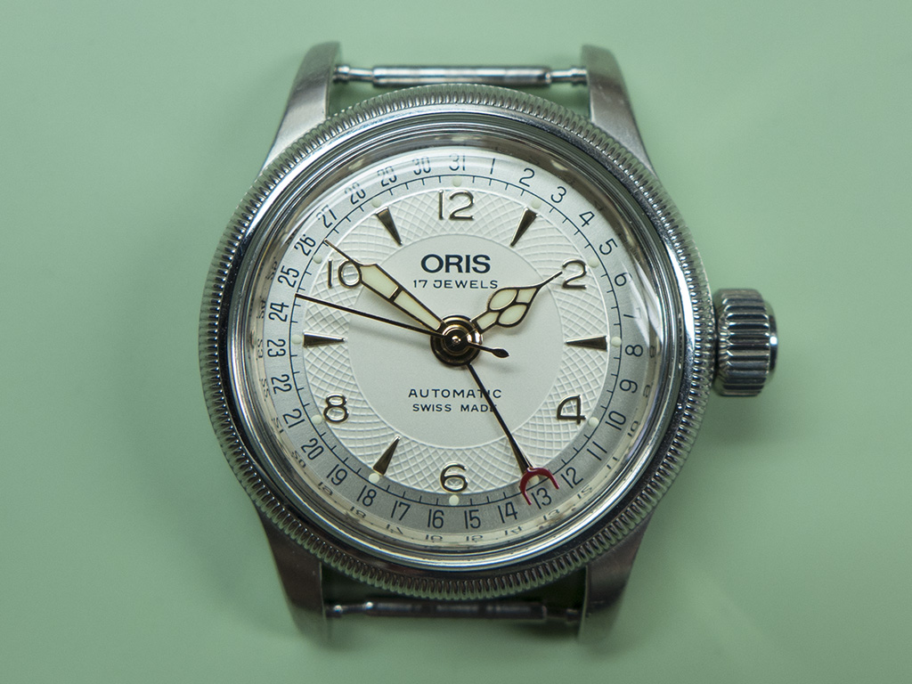Oris have been making wristwatches in Hölstein Switzerland since 1904. They’ve been responsible for some iconic designs throughout that time, of note is the big crown pilots watch introduced in 1938 and of course the feature watch of this post (introduced in the same year), the pointer, which as the name suggests uses a hand to point to the date which is written around the periphery of the watches dial. This ladies example recently came in for a new crystal and a service and it typifies Oris’s pointer series of watches with its guilloche type ring beneath the numerals, it’s cathedral hands and crescent style date pointer hand.