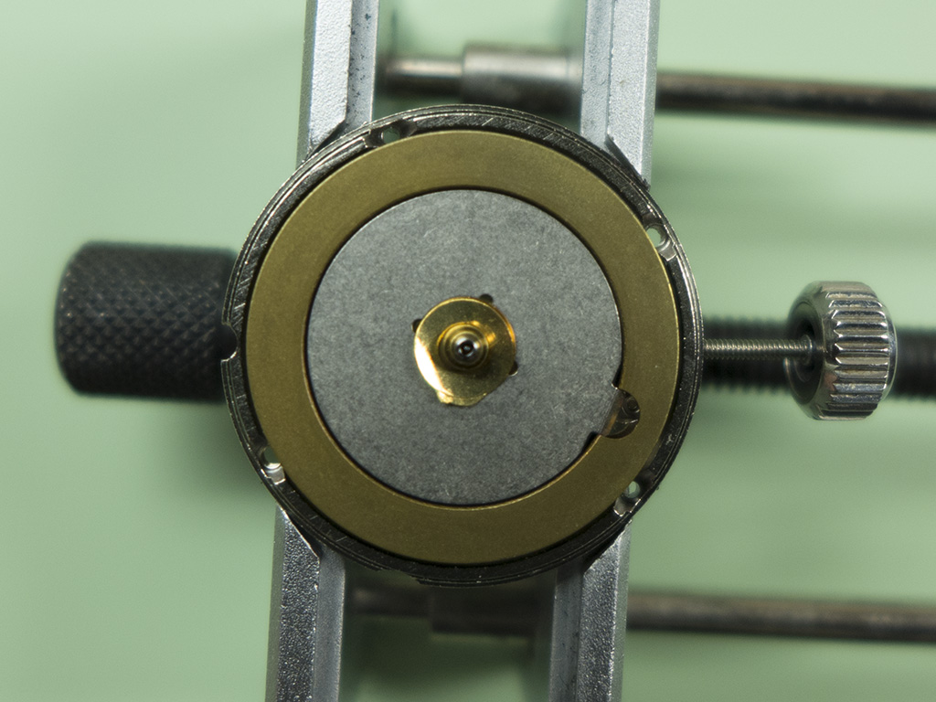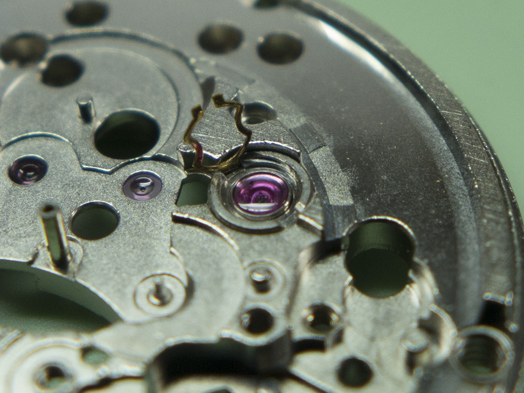 Once the components are clean the first thing I reinstall regardless of the movement is the top balance jewel and cap, it’s ready for the spring to be pressed in place here.