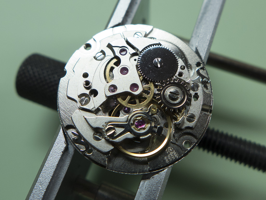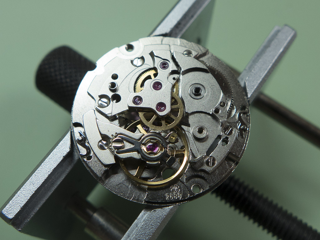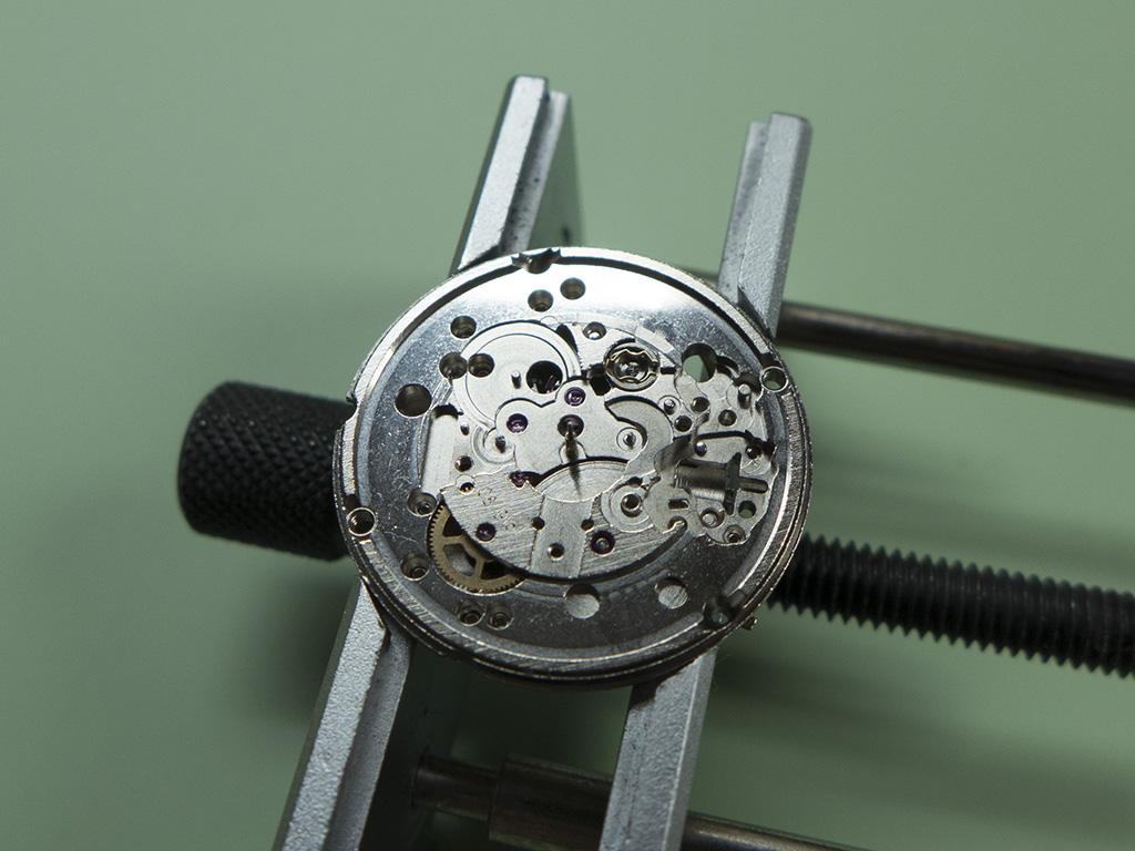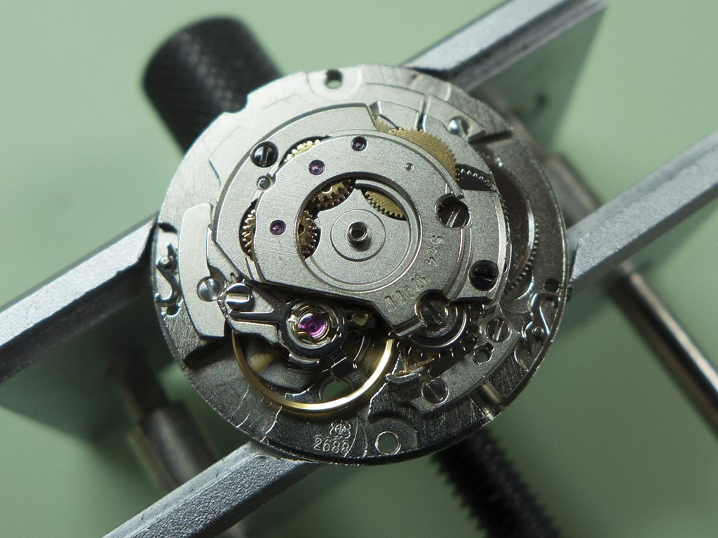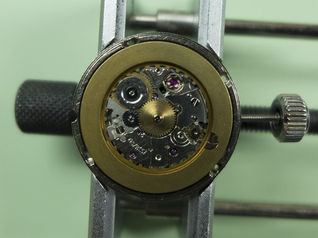 With the hands and dial removed you can now see the novel way the 4th pointer hand is driven. Some pointer movements drive the hand in the traditional way using a series of gears to drive a central wheel, this little ETA 2688 movement utilises a traditional calendar ring which drives a plate connected to a central wheel. As there’s no other calendar day or month display to be obstructed it can afford to use this novel technique.