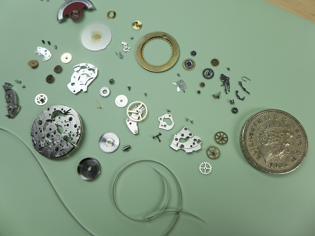 These ladies movements are on a scale that much smaller than a one from a gents watch, for comparison I’ve placed a one pound coin next to the components.