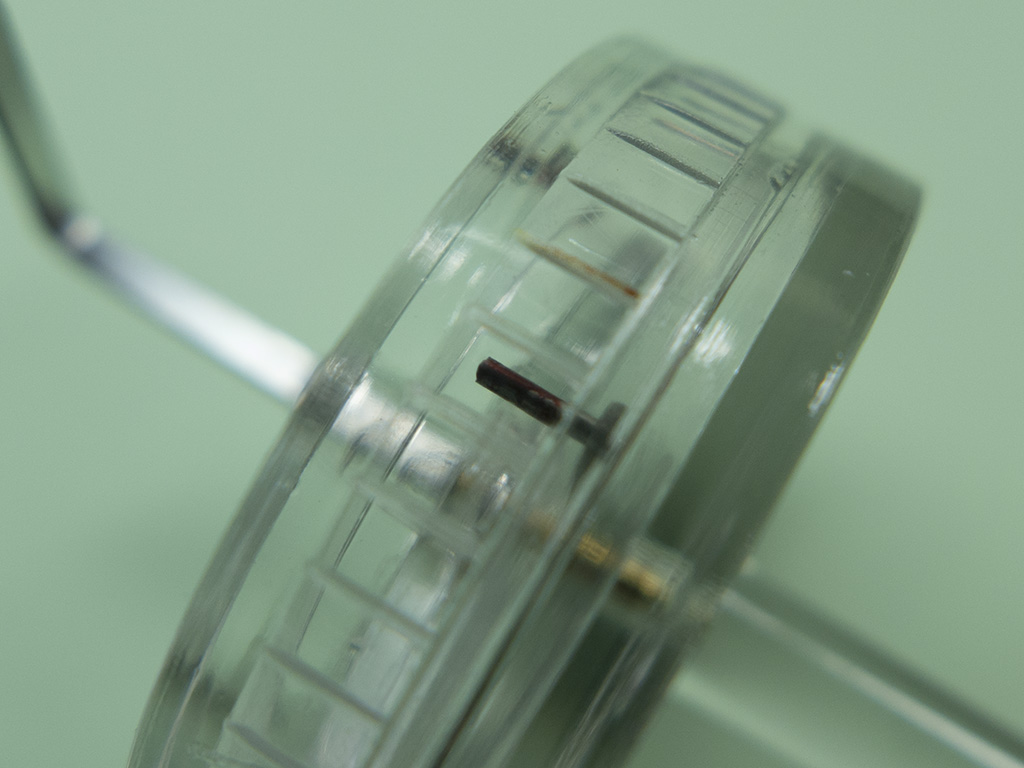 The watch was put on the timing machine and it had a beautifully steady trace with a healthy amplitude so it wasn’t in need of a service just yet, however it was gaining about 17 seconds a day which needed addressing. The adjustment of the rate isn’t achieved by moving a regulating lever to effectively shorten or lengthen the hairspring as in the majority of modern watches. In the Rolex adjustment is carried out by moving small weighted screws on the periphery of the balance wheel, this is Rolex’s microstella method. As you can see from the picture there are two different lengths of screw, a short pair and a long pair placed opposite each other on the inside diameter of the balance.