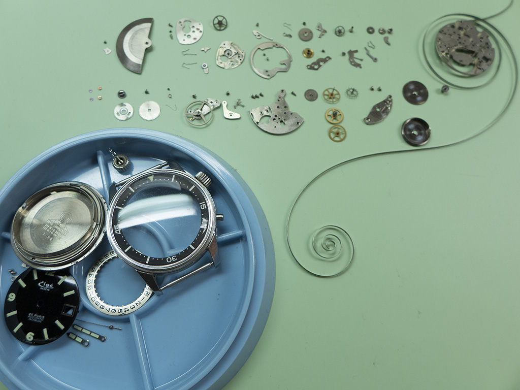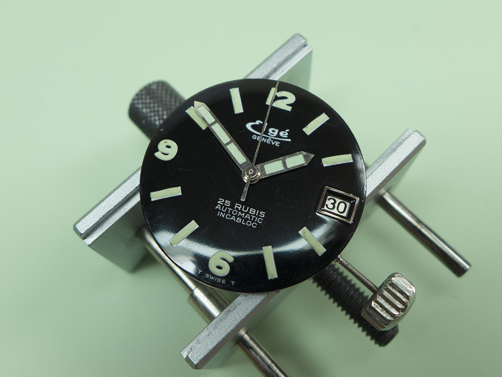 Elgé Genève watches were produced by the French manufacturer Ets Yola based in the large town of Annecy in the French Haut-Savoie region, which has a strong watchmaking tradition, in fact Annecy’s just over the Swiss border from Geneva. They were in business from the mid 1940’s until the early 1970’s and other Ets Yola brands comprised of Yola, Elga and Elgé. This particular example is a dive watch powered by the A Schild 1712 movement housed in an ESPA Super Compressor case. It’s in remarkable condition and the owner just wanted a full movement service, the lume examining and stabilising (it appeared a little fragile in the hands) and if possible the case made waterproof once more.