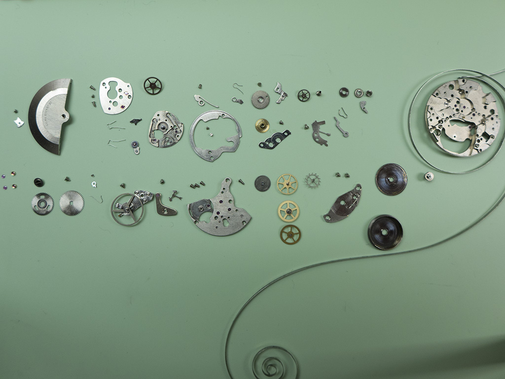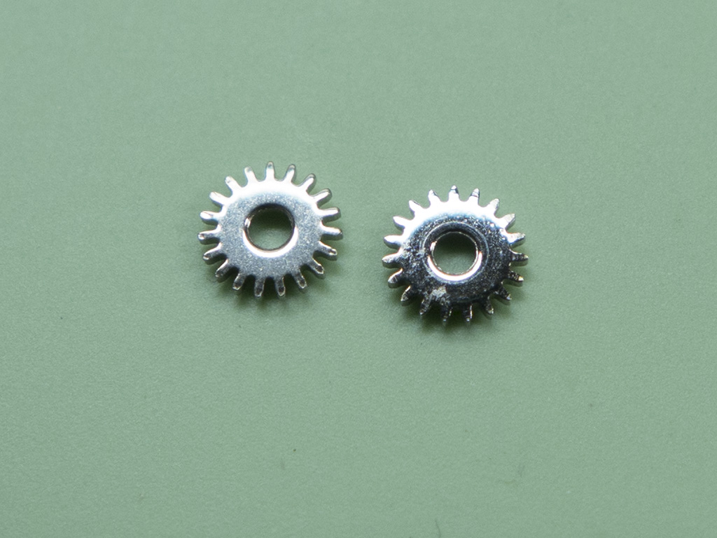 A number of new parts were required, the time setting was a little notchy and gritty due to a worn winding pinion, you can see where the teeth have been worn down over time on the original pinion.