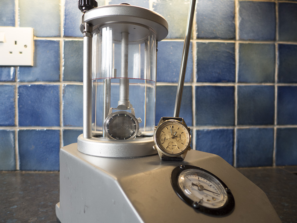 I replaced the caseback seal, silicone greased it and the crown seals then buttoned it up for a 6bar pressure test. The advantage of doing a pressure test with no movement present is if the case has become pressurised even by a tiny amount, when you release the pressure in the chamber the crown or crowns will blow out as there’s no movement to hold the stem in place. This means if you do a dry run first with no water present and the crowns stay in place, you can be pretty confident the case will be fine during the actual test. Here’s the case in the chamber and up to pressure.