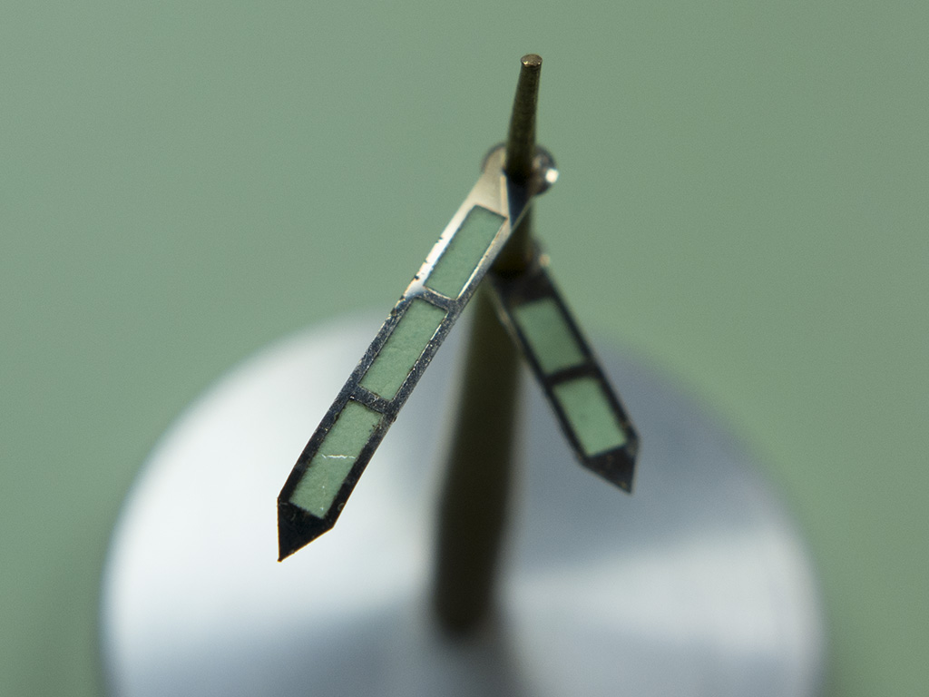 The hands were inspected and you can see in this shot where the lume had shrunk over time and cracked in a couple of places. Nothing was lost but it was very fragile.