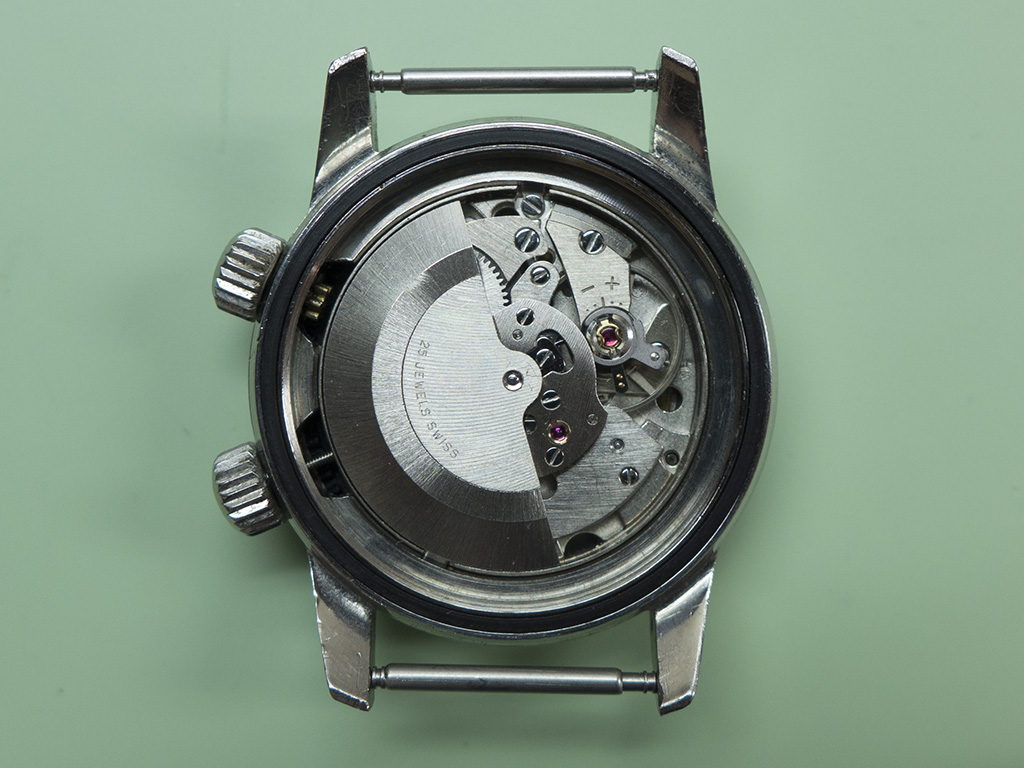 With the caseback removed you can see the patent information on the inside underneath the divers helmet logo, also now on show is the low beat (18,000bph), 25 jewel, automatic A Schild calibre 1712 movement.