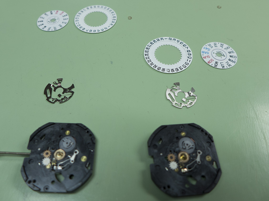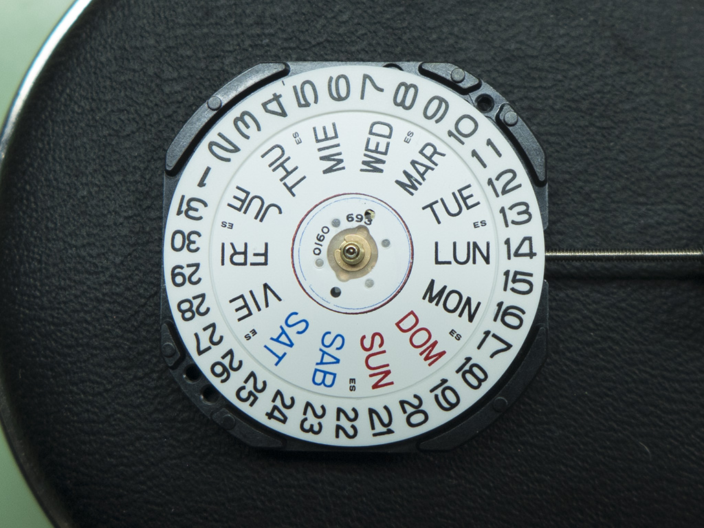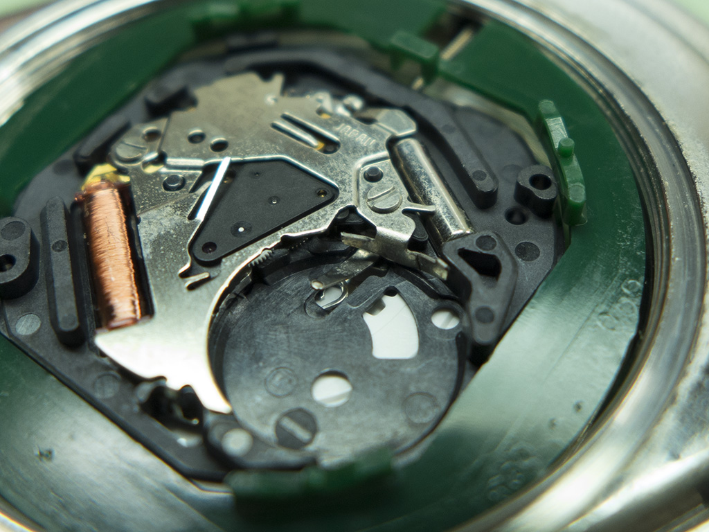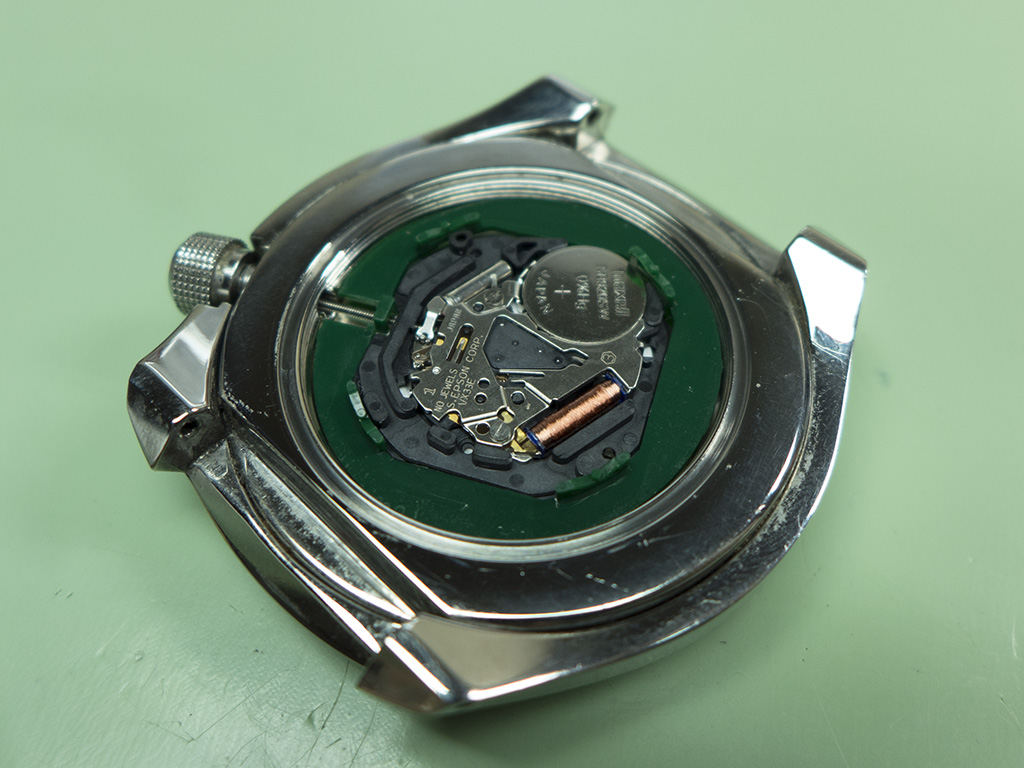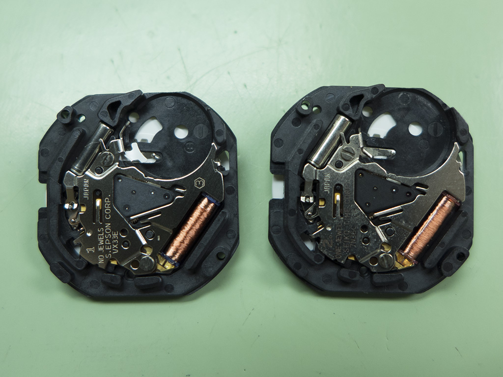 The sawtooth uses Seikos 7N36c movement and parts for these have been unavailable for some time, in fact replacement movements are unavailable. However, there is an alternative that can be used, Seikos VX33e. These are relatively inexpensive so it’s more cost effective to swap them out than to fault find and repair a dead one. A new movement was ordered and as you can see compared to the original it looks remarkably similar.