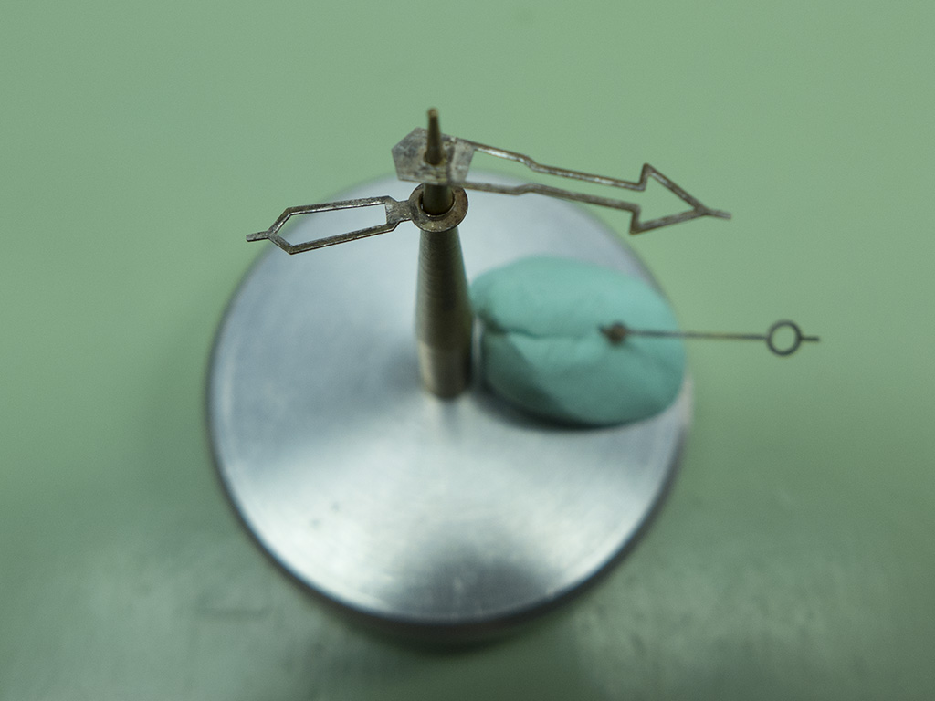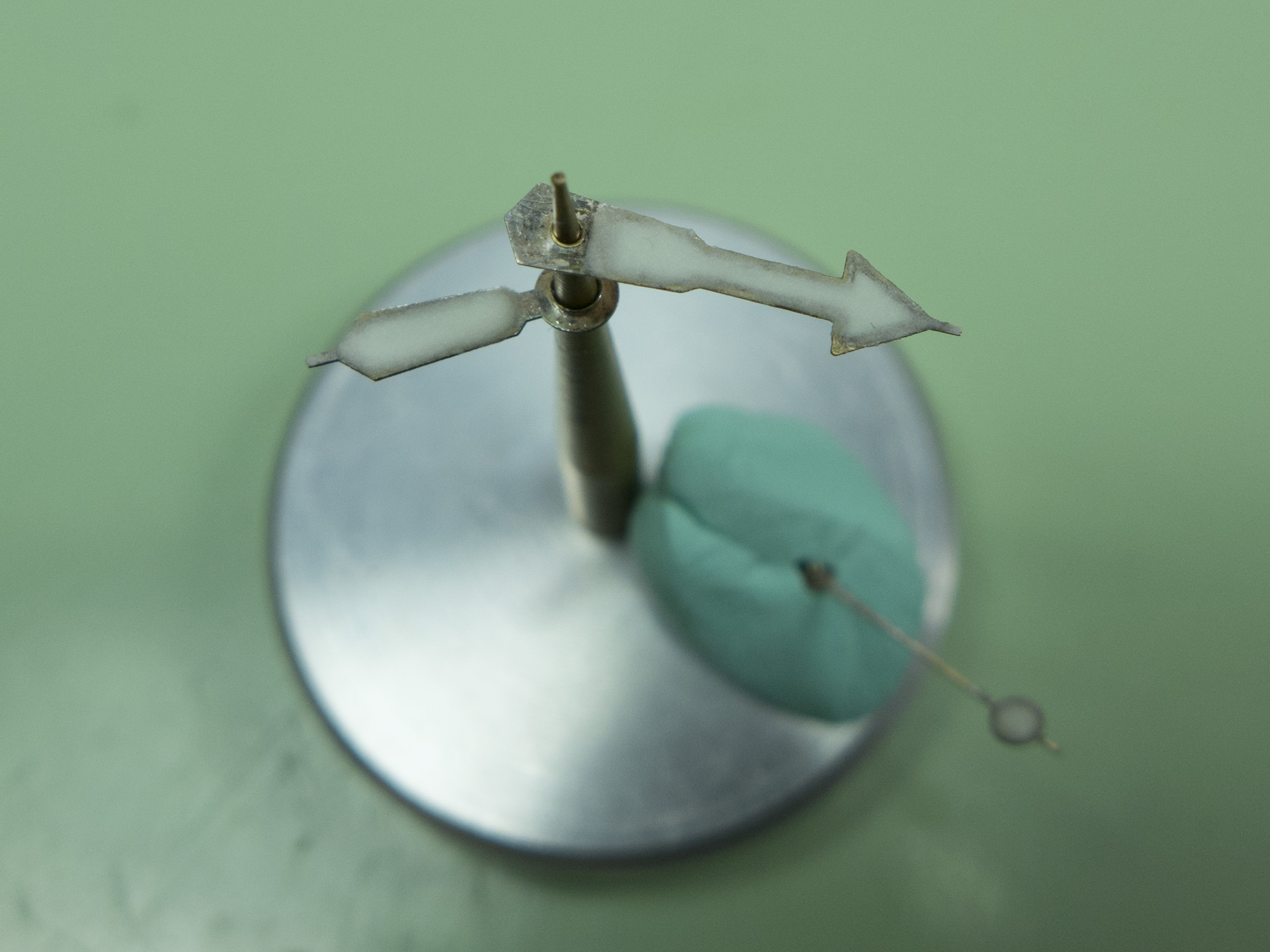 Now back to the hands. As gold replacements are just not available (especially the seconds hand) a bit of lateral thinking was needed. I found an original set of 6309 hands in the parts drawer that had rotten lume which had attacked the plating on the frames. These hands are plated over brass so I decided to polish the plating off completely and see what the result was like.
