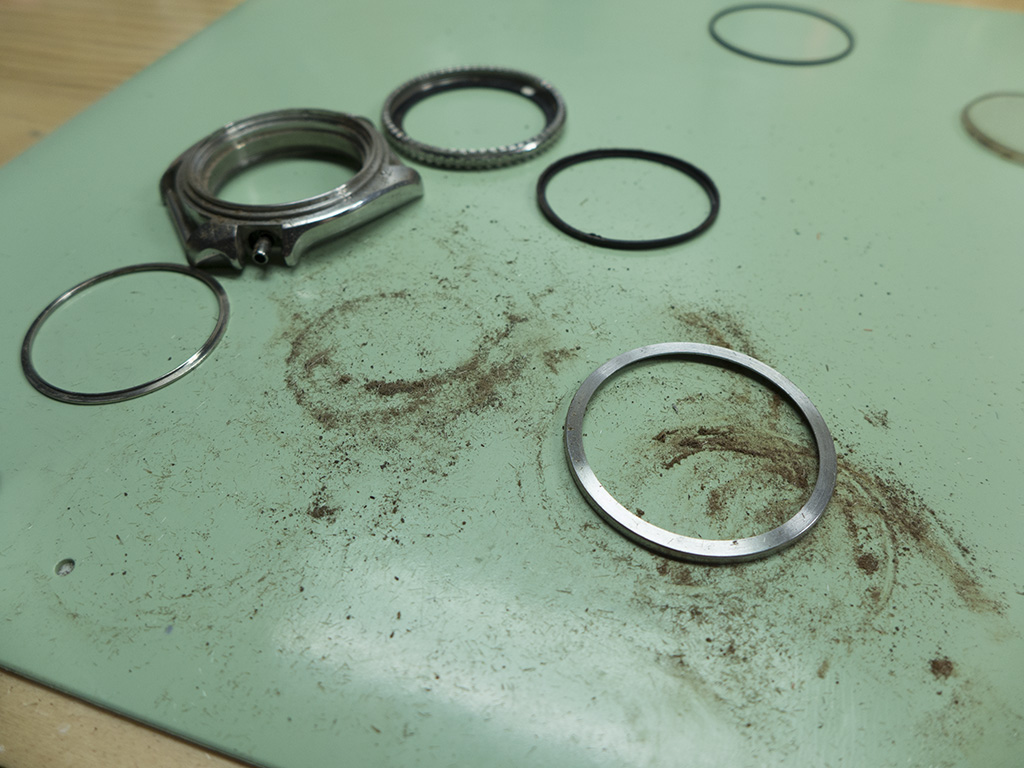 The case was stripped to install a frosted bevel crystal and good job it was! Nothing seemed amiss as the bezel turned freely but once it and the crystal retaining ring was removed there was a lot of corrosion underneath. If left unchecked this would have done quite a bit of damage to the case and ring. It also rendered the crystal seal unusable so a NOS one was fitted.