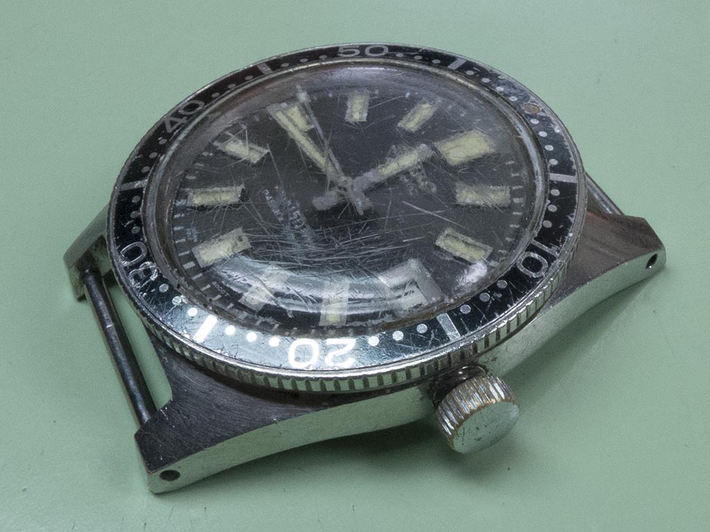 The watch arrived looking a little tired, which regarding the exploits it’s been through is hardly surprising! The immediately noticeable issue was the original crown had been replaced with an incorrect one, the hands were stuck, the watch didn’t tick and the turning the crown had no effect on setting the time or date. It did have the basis of a good original watch though, the lume was all present and not particularly stained, although there was quite a bit of scale and corrosion on the chromed lume wells. As everything with regards to the dial was present and in reasonable condition and the lume hadn’t turned black it was more a case of conservation than restoration.