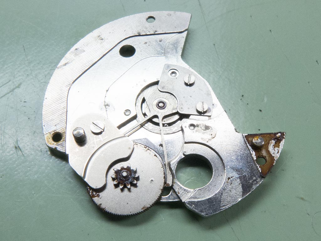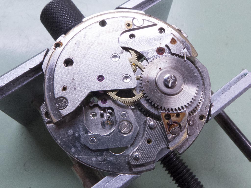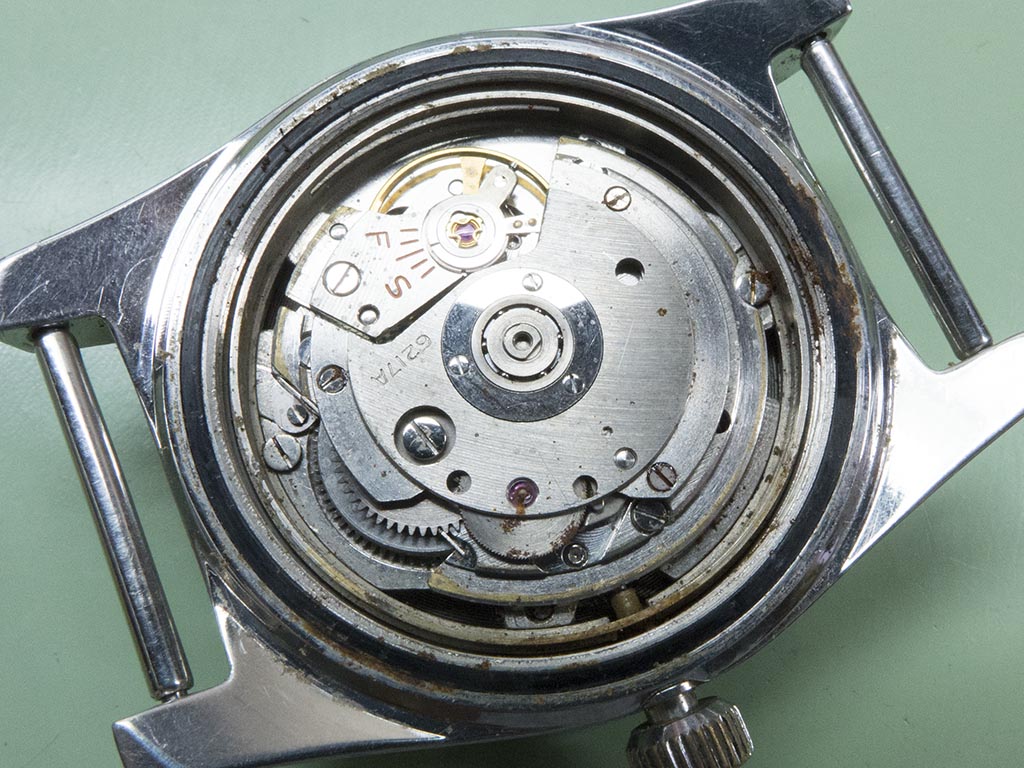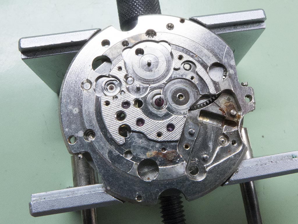 With the caseback removed all the parts appear to be still there, however there’s a little more corrosion than I’d like to see, especially around some of the screws. Another problem is the rotor won’t turn at all.
