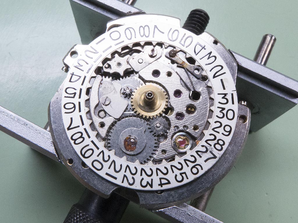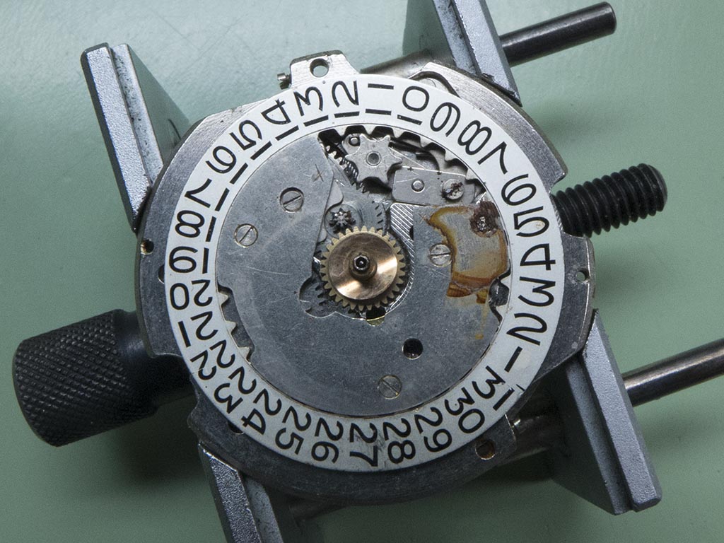 And with the top plate removed the jumper post is so corroded the date jumper is stuck in position, however the date wheel has survived remarkably well.