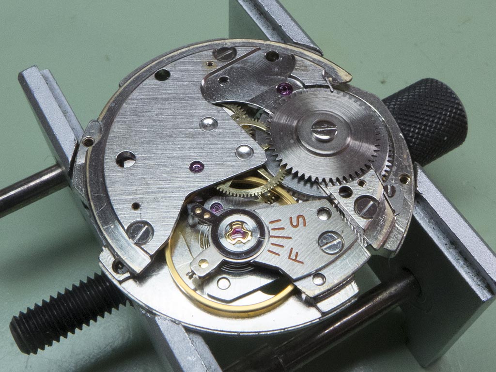 A search through my parts drawers locates a NOS balance assembly which I’ll use, I’ll re-staff the old balance when I have time. Also found was a good arbor, centre wheel, transmission wheel and screws.
