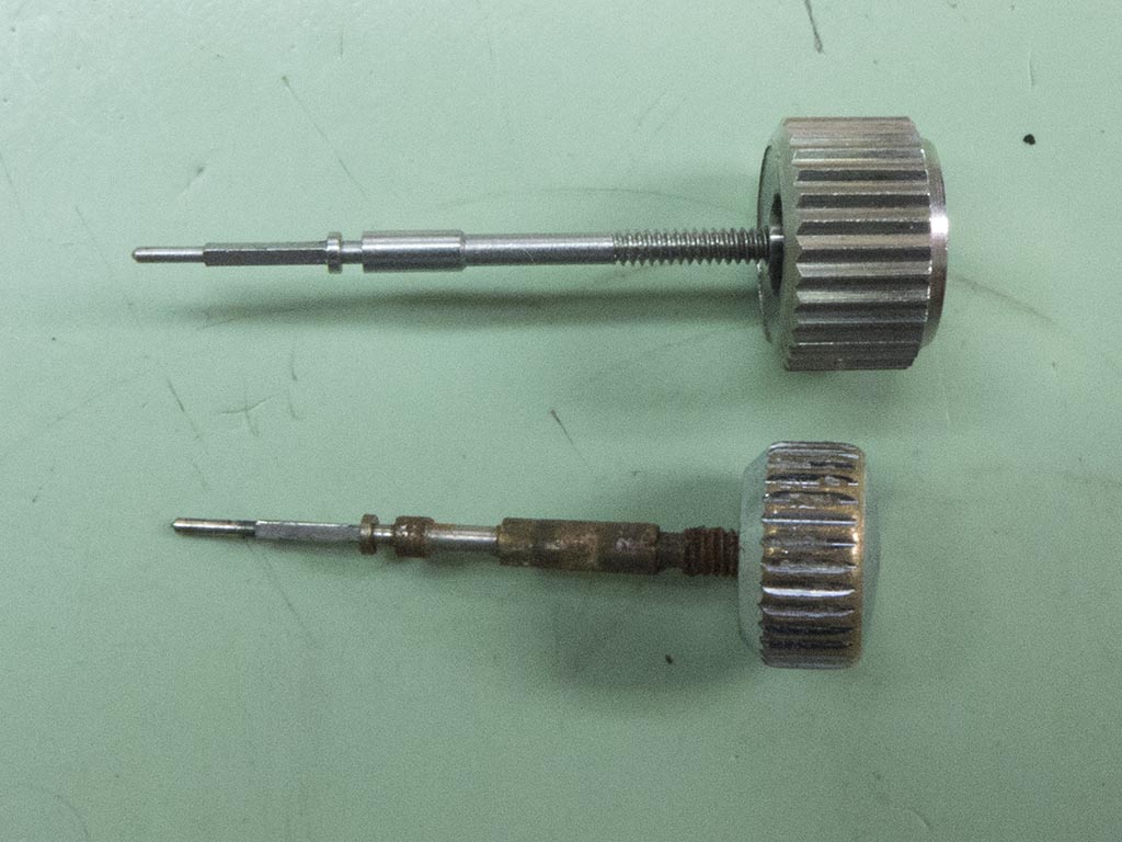 Before starting on the calendar side a NOS stem and crown was fished out of the parts drawer. You can see that not only was the old crown incorrect, so was the stem.