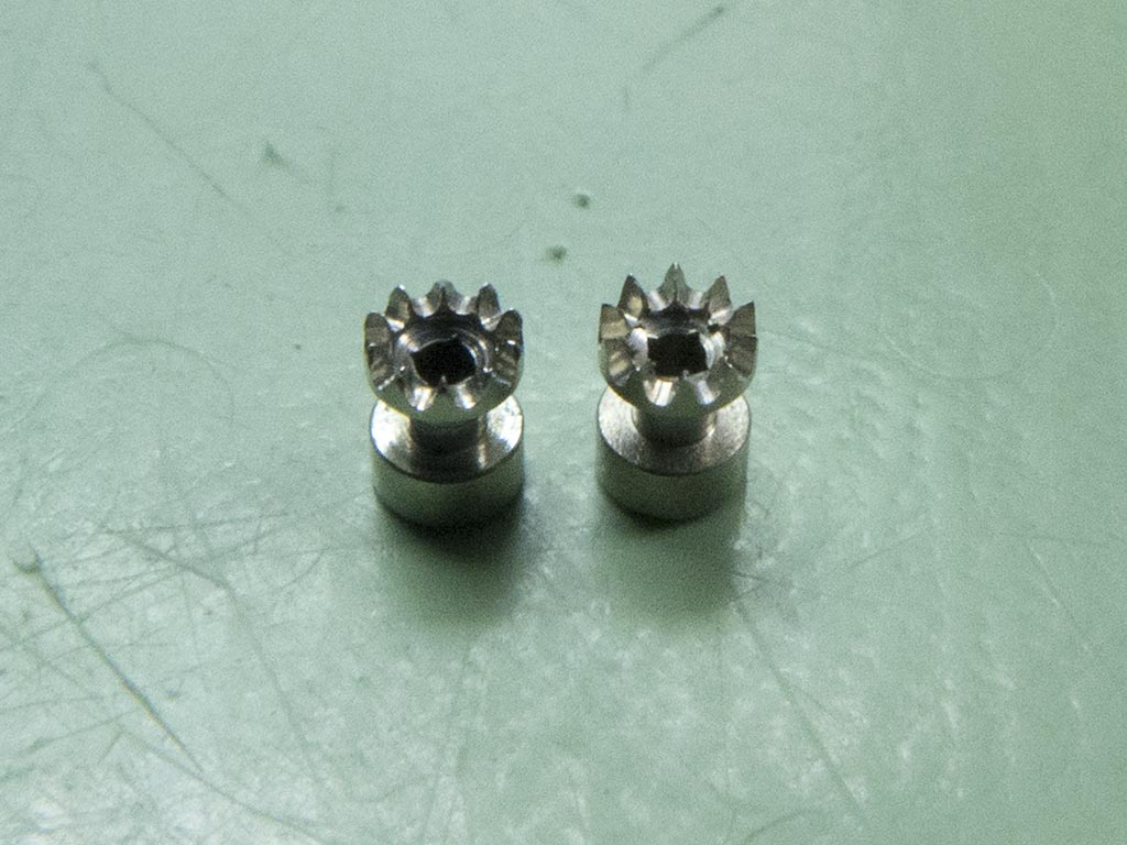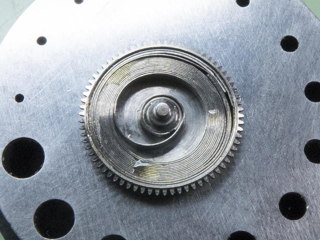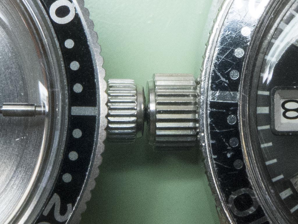 The watch had the usual 62 calibre problem of a slipping clutch so the parts drawer was raided for a NOS one, you can see the worn/chipped teeth on the original one on the left.