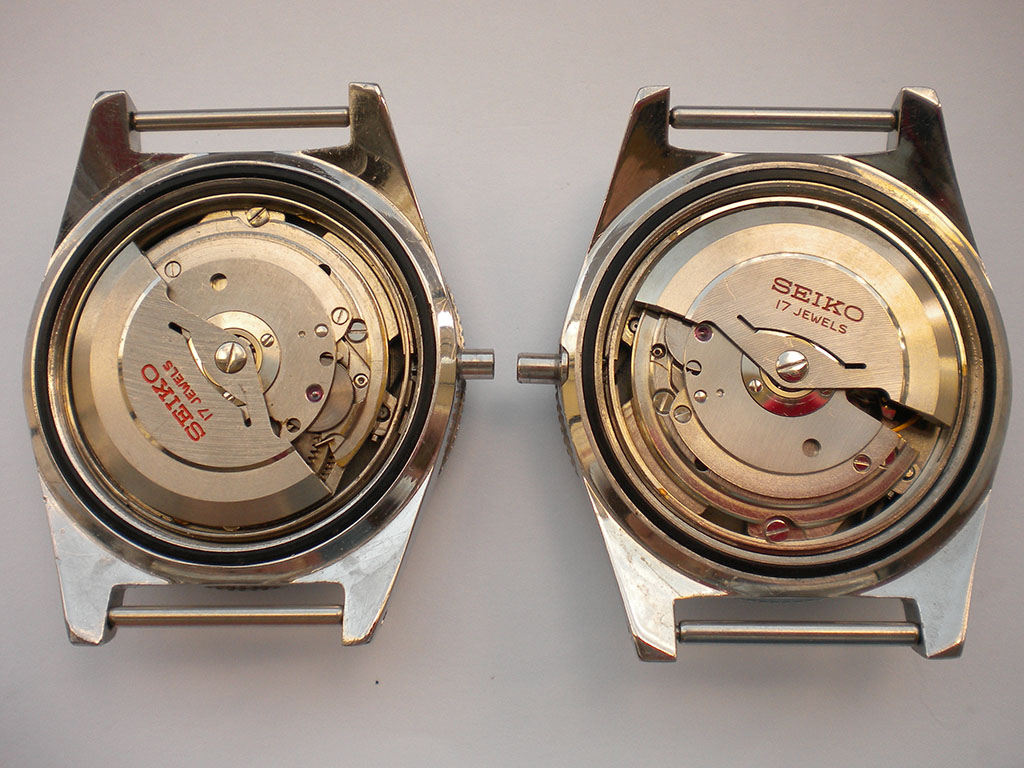 The crowns are interesting in as much as they share the same part number with the big crown. I have a few Seiko case reference books including some from the mid to late sixties and none of them specify a different number for the smaller crown, I presume when these watches were serviced they received the larger crown if it ever needed changing. You can see the size difference in these shots, both are signed with the Seiko logo.