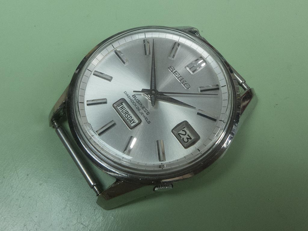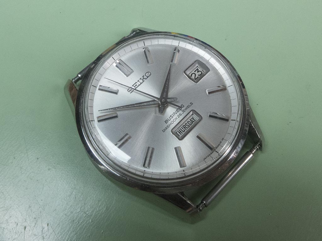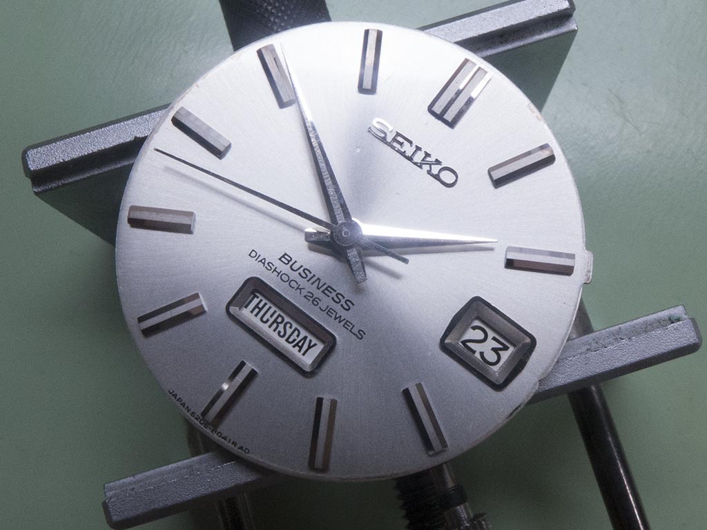 During the 1960’s a lot of different Seiko models carried the “Business” or “Business A” logo. This branding appealed to Seikos marketing department for a short period and seemed to be aimed at the Japanese salary man. He could proudly wear his new Seiko to work knowing it was designed for “business” people! The example featured is powered by the calibre 6206B, an automatic wind, 18,000bph, 26 jewel day/date movement. As I’ve mentioned before the 62xx series powered a vast range of Seikos models from divers to Grand Seikos. This one came in for a service and to sort out the common problem of the crown jumping whilst setting the day, date or time. As can be seen these models are a handsome watch which wear a lot bigger than they actually are due to the slim bezel making the dial look huge. A feature I particularly like about these is the full day window, these were typically positioned at 6 or 9 0’clock on the dial. The sunburst finish of the dial is also a nice touch.