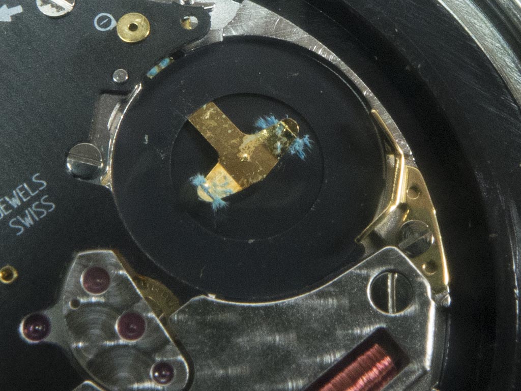 Underneath the battery some corrosion is present, this is a killer for quartz watches if left unchecked, it can rot through terminals and destroy circuit boards.