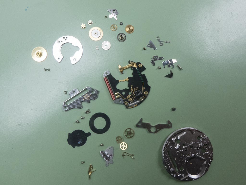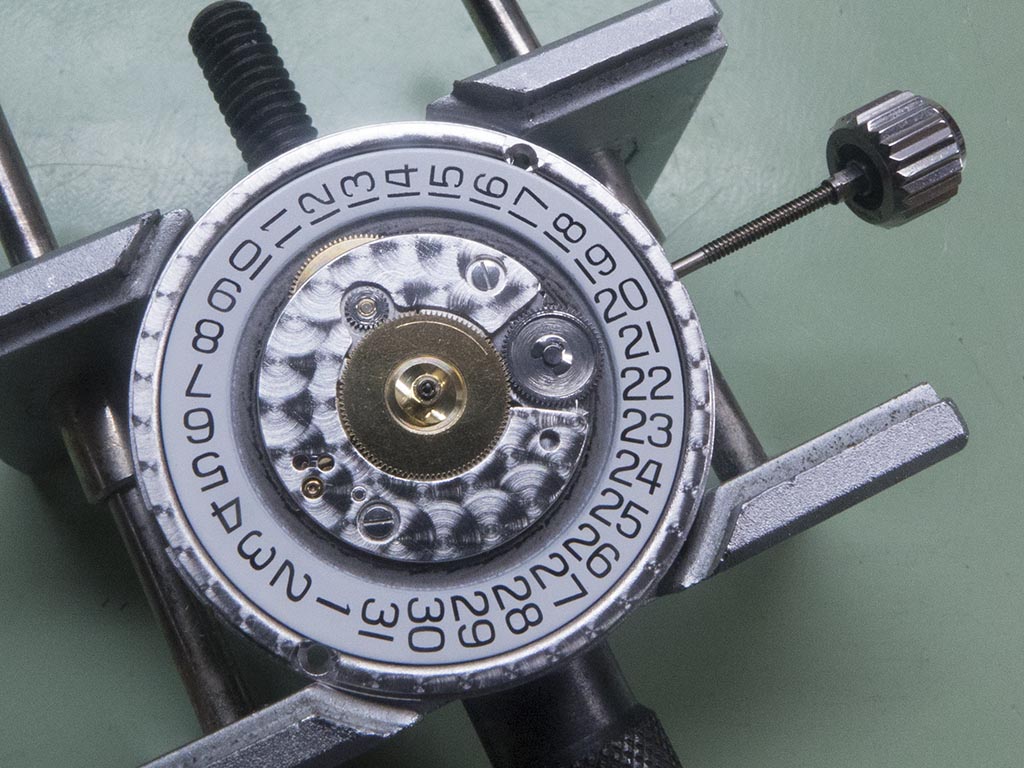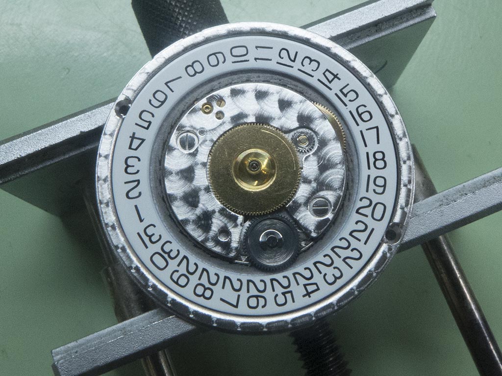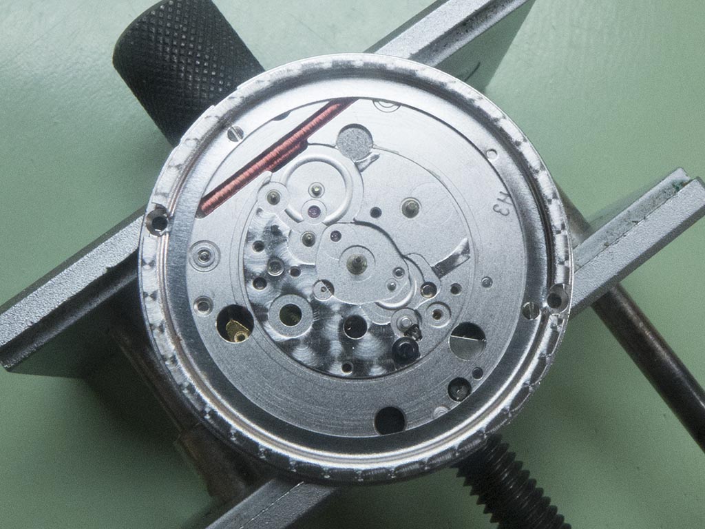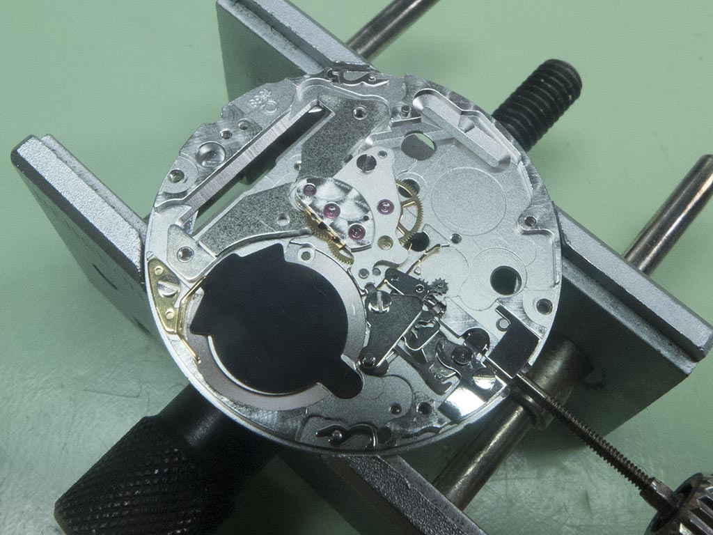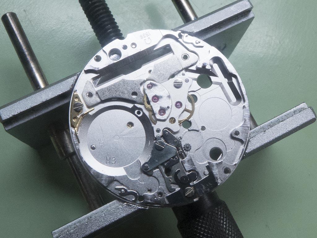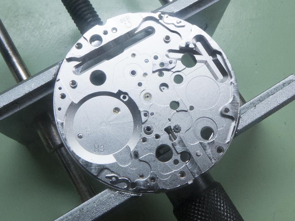 With the movement turned over and the circuit board removed the train and keyless work can be seen.