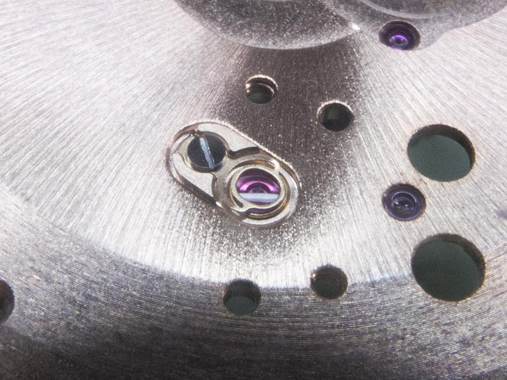 Here’s a shot of the balance staff top jewel assembly after refitting, you can see the unusual spring holding the jewel cap down.