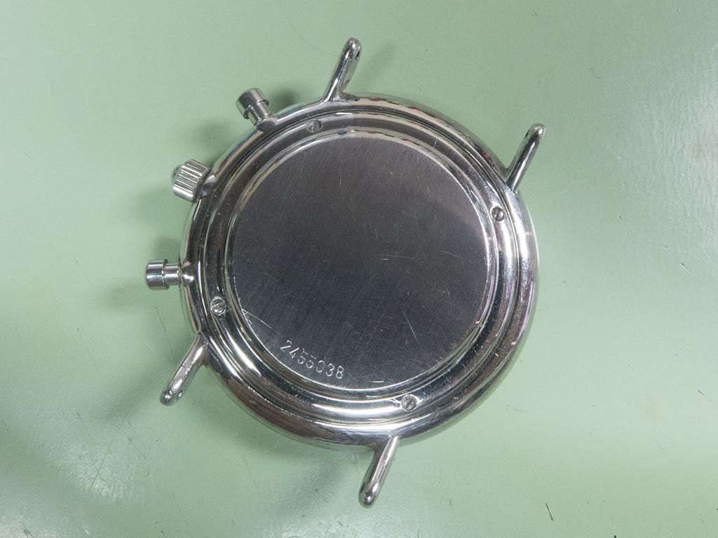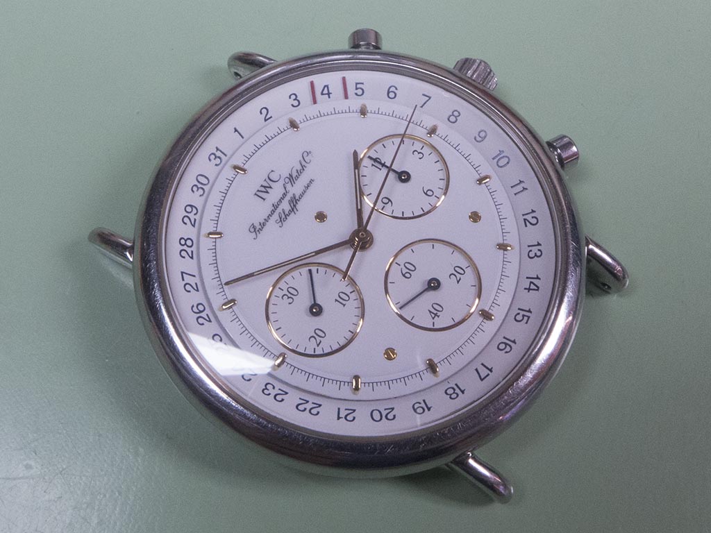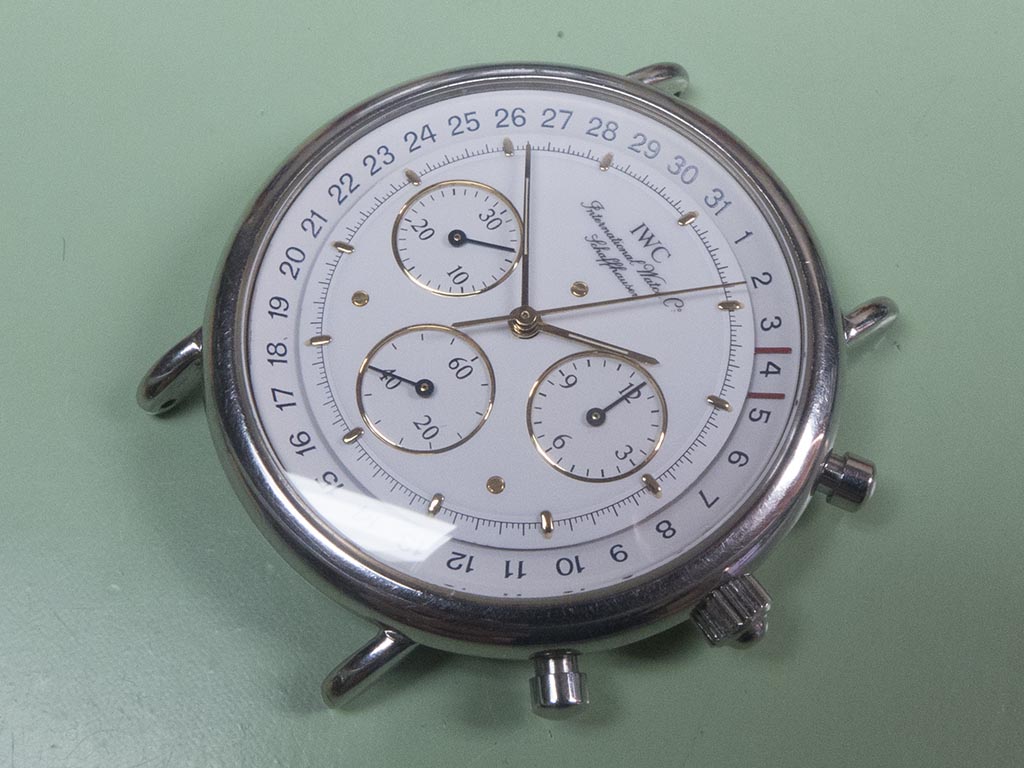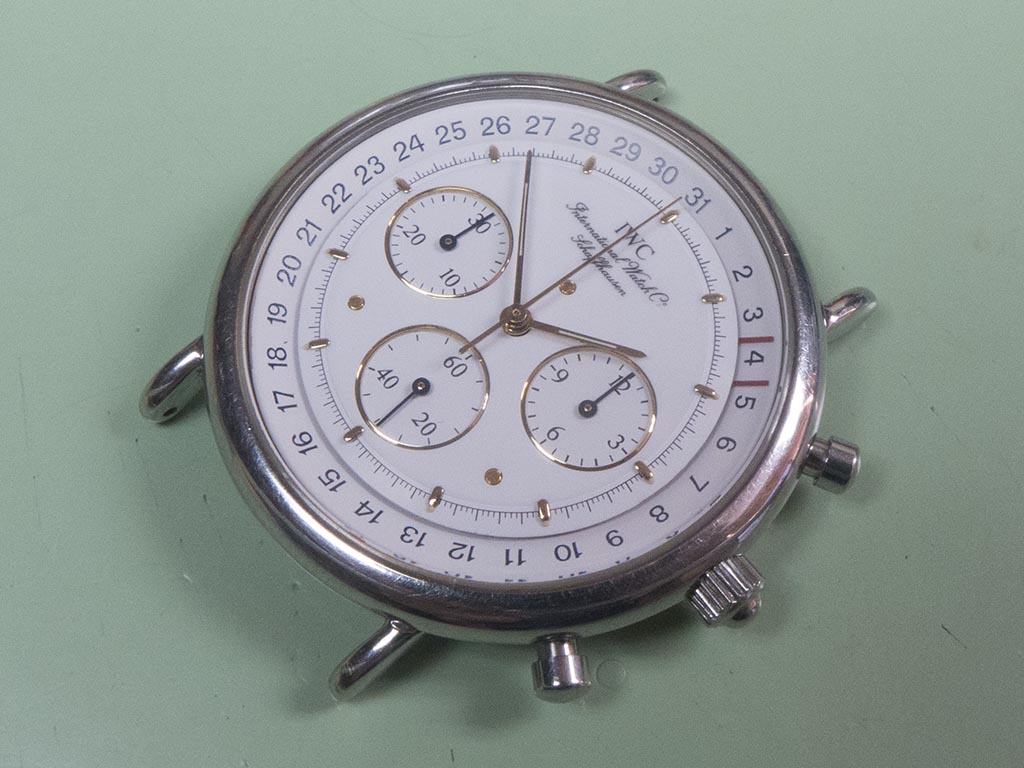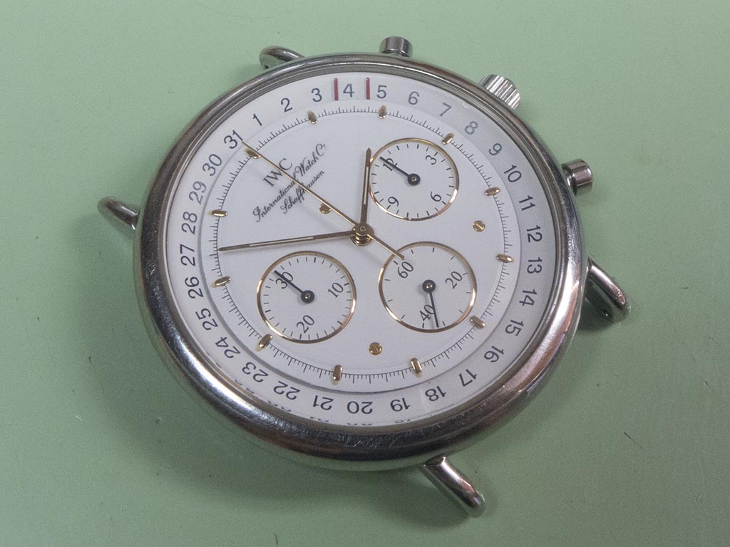 The International Watch Companies mecaquartz range of chronograph watches use a hybrid movement with quartz powered time and chrono functions coupled with a mechanical reset. The mechanical reset instantly snaps the registers back to the rest position as opposed to a fully quartz movement which has to advance them back to rest. The movements were based on the Jaeger LeCoultre calibre 630 and 631, the 631 having the addition of a moonphase indicator. These movements have two motors, one powering the timekeeping hands and the other powering the chronograph. The watch featured is based on the 25 jewel 630 calibre. As you can see from the photograph it has an unusual date indicator, much like a pointer style but different in as much as only the two red bars that frame the date are visible on the dial. It came in with various issues, the most immediate being that it didn’t run, neither the time keeping or the chronograph.