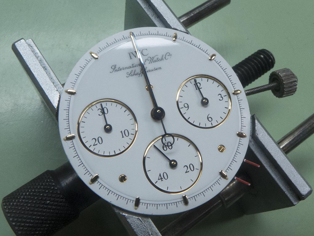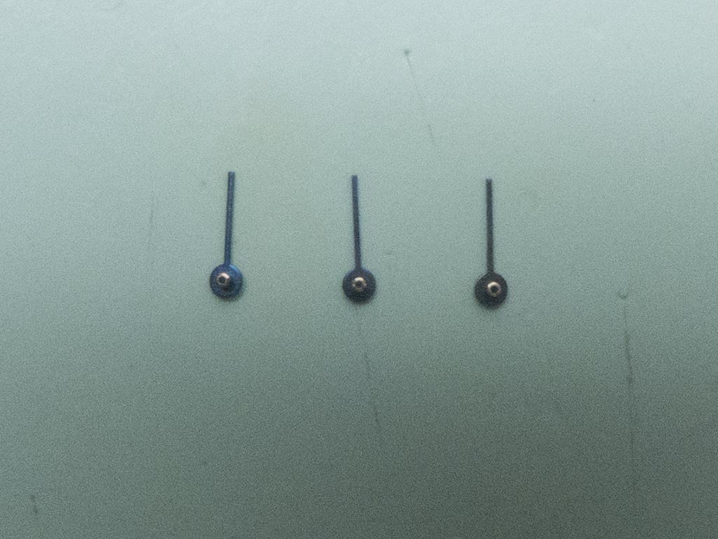 This was another setback as the chances of finding an original replacement hand is pretty slim. I decided to try a fix I’ve used before, the only problem was I’ve used it on normal sweep hands never on chronograph ones. These are subjected to relatively high forces when reset so I wasn’t sure if it would work, however nothing ventured nothing gained! I cleaned the hands pipe and applied a miniscule dab of flux. I then heated my soldering iron and applied a dab of solder to the pipe. This fills up the tube and the crack.