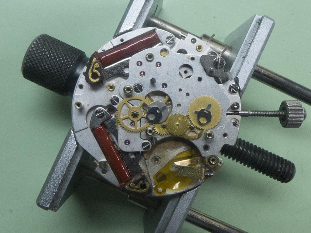 The components were cleaned and the reassembly began, there’s no photographs of this procedure I’m afraid as my cameras battery went flat just before I proceeded. Not good timing! The movement was assembled and with the straightened stop lever it ran beautifully. The only issue now was the sweep hand didn’t want to reset to the same position! The first thing I look for in these situations is the condition of the hands pipe. These do spread after they’ve been removed a few times so usually they can be nipped back up. When I inspected it closely I could see the pipe had actually split at some point, so there’s little wonder it wouldn’t reset.