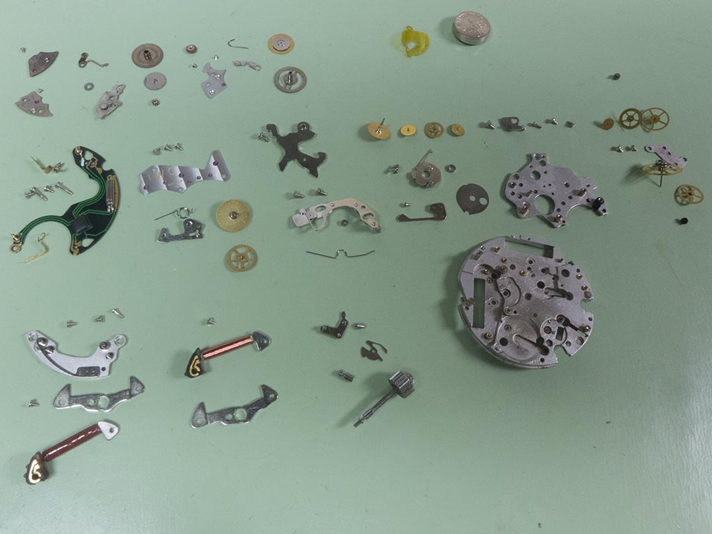 Unfortunately neither the chronograph nor the timekeeping side ran which indicated a further problem somewhere. As the electrical side checked out OK the problem must be mechanical. I noticed when pushing the crown back in from the time setting position that it felt a bit spongy, there was no positive click as you’d expect. This led me to believe that there was probably an issue with the hacking feature, on a quartz watch the movement is hacked not by applying a brake but by breaking the power to the integrated circuit. The watch was then fully stripped ready for cleaning and inspection.