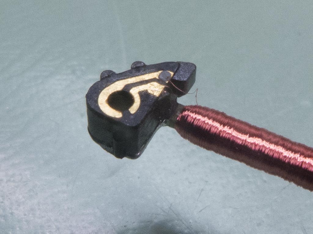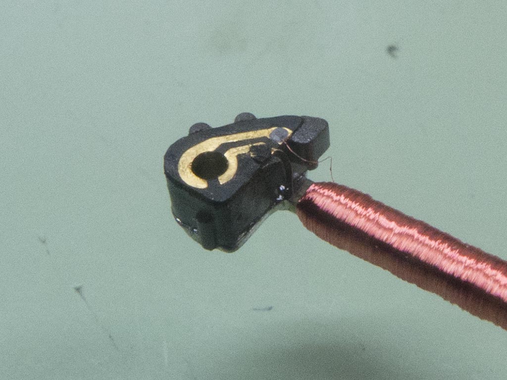 This was a big disappointment as the coil was brand new, and a bit of setback as sourcing these coils took weeks and they weren’t cheap! The alternatives were to send it back (abroad) and be prepared for a lengthy delay whilst the supplier decided whether or not to replace it, or reattach the cap to the plate then do the same with the coil wire. I decided to try the latter. The cap was bonded back to the plate with some two part epoxy. You can see the two ends of the fine wire in this picture. The grey dot on the one that’s still attached is conductive adhesive. I cleaned the varnish insulation back from the broken end of the wire and cleaned the adhesive from the brass contact plate.