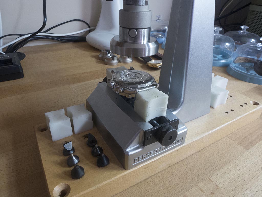 The watch is loaded into the tool and the nylon jaws are tightened up to keep the case from turning.