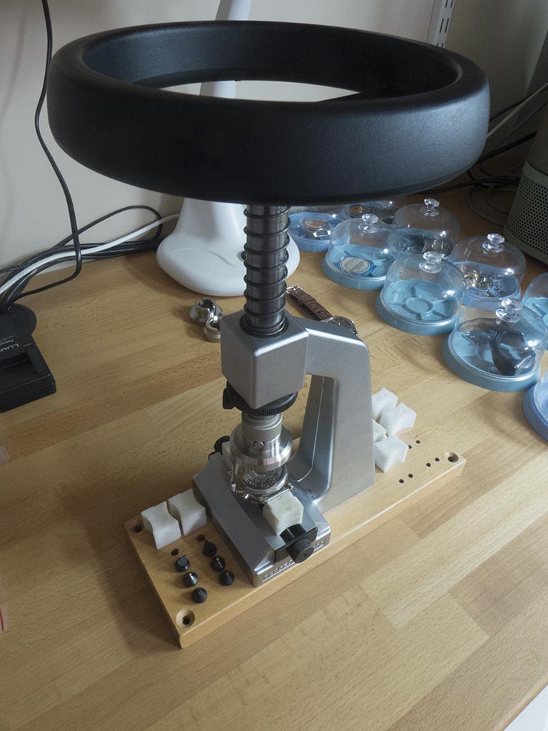The die is lined up and lowered onto the caseback, press down and turn anticlockwise to unscrew it. There is a locking ring you can utilise to prevent the die trying to force itself upwards and slip, this is particularly useful for Rolex casebacks, however I find it’s not necessary to utilise it with Breitlings.