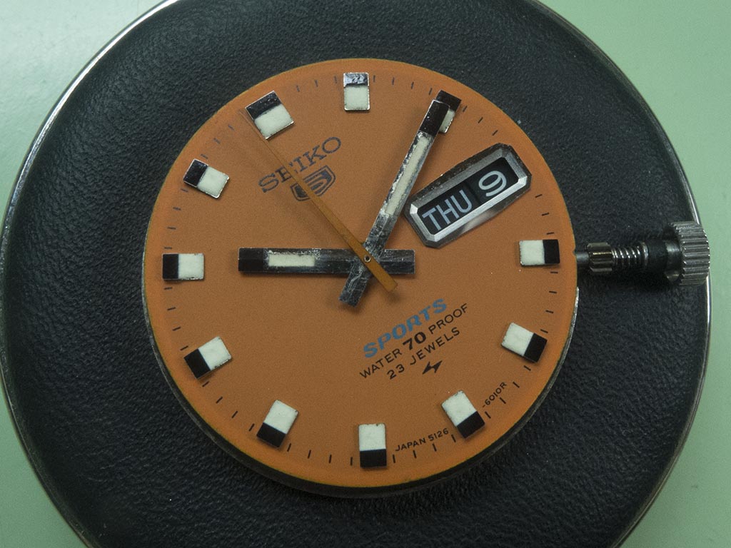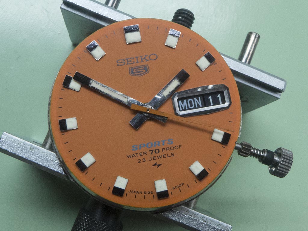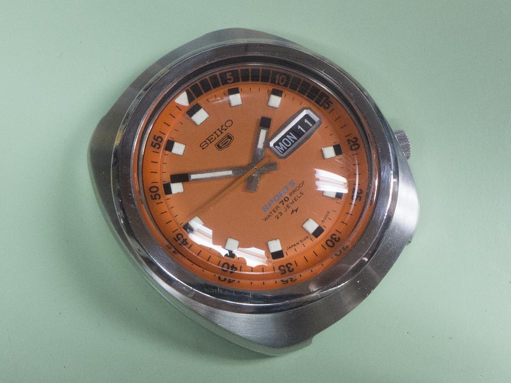 The Seiko 5126-6010 is an unusual watch for a number of reasons. To begin with it’s a Japanese domestic market model which means exactly what it says, it was designed and produced for the Japanese domestic market! Seiko had some much funkier designs for their home market than they did for the rest of the world and this model featured is no exception with its cushion case, orange dial and inner rotating ring. The orange versions of these models remind me of Doxas Sharkhunter, probably no coincidence considering the original orange dialed Sharkhunter was introduced in the 1960’s and Seikos 5126-6010’s date from the late 1960’s. Another unusual feature of this watch is the calibre 5126 movement. It’s an automatic winding, 23 jewel, 19,800bph movement with a day date complication. These weren’t produced for very long and consequently you don’t see them very often these days. The movement architecture is quite a departure from what Seiko was utilising in their other calibres, notably there’s no pawl and transmission wheel autowind components, and the keyless work looks quite different too. This calibre has more in common with the Swiss method of using reverser wheels to convert the rotors movement into winding the mainspring. As you can see from the picture below this model was part of their “Sports” range, watches that were part of that range had their water resistance upped to 70m depth. Interestingly this model was also given the “5” designation. “Seiko 5” has these days become a symbol of their lower range value for money watches but when the “5” designation was introduced in the 1960’s it was a symbol of Seikos rugged, dependable and unique watches which was meant to represent 5 different selling points, automatic winding, day and date displayed in a single window, water resistance, a recessed crown at the 4 o’clock position and a durable case and bracelet. It’s nice to see that this example still has it’s original signed “Razor” bracelet that’s sized for a European wrist.