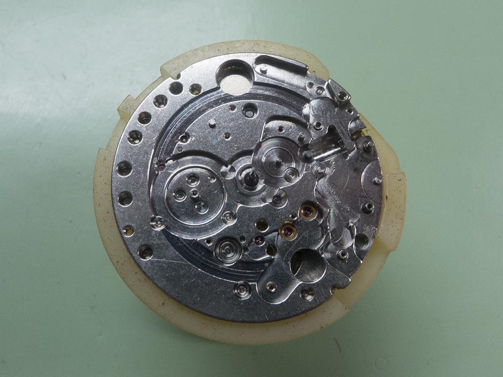 This is where the biggest differences are apparant, there’s no pawl and transmission wheel used to convert the back and forth motion of the rotor into winding the mainspring. The top plate is again totally different to anything you’ll see on Seiko 4 and 6 series of movements.