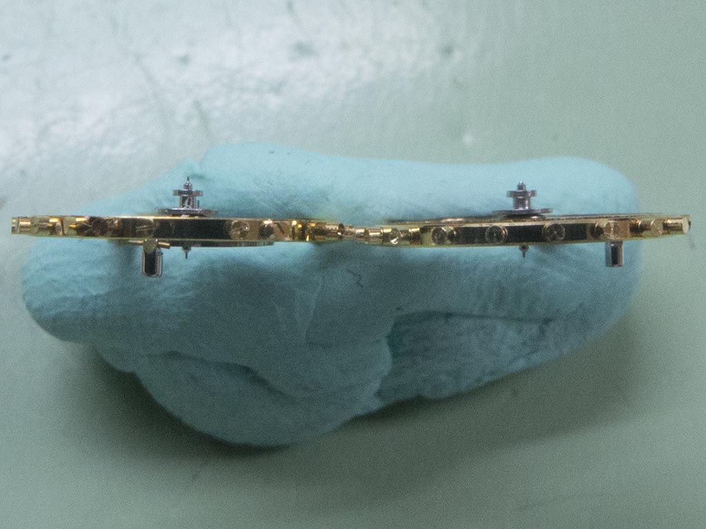 Once this is done the balance can be fitted to the cock. You have to ensure the hairsprings curve passes through the centre of the curb pins.
