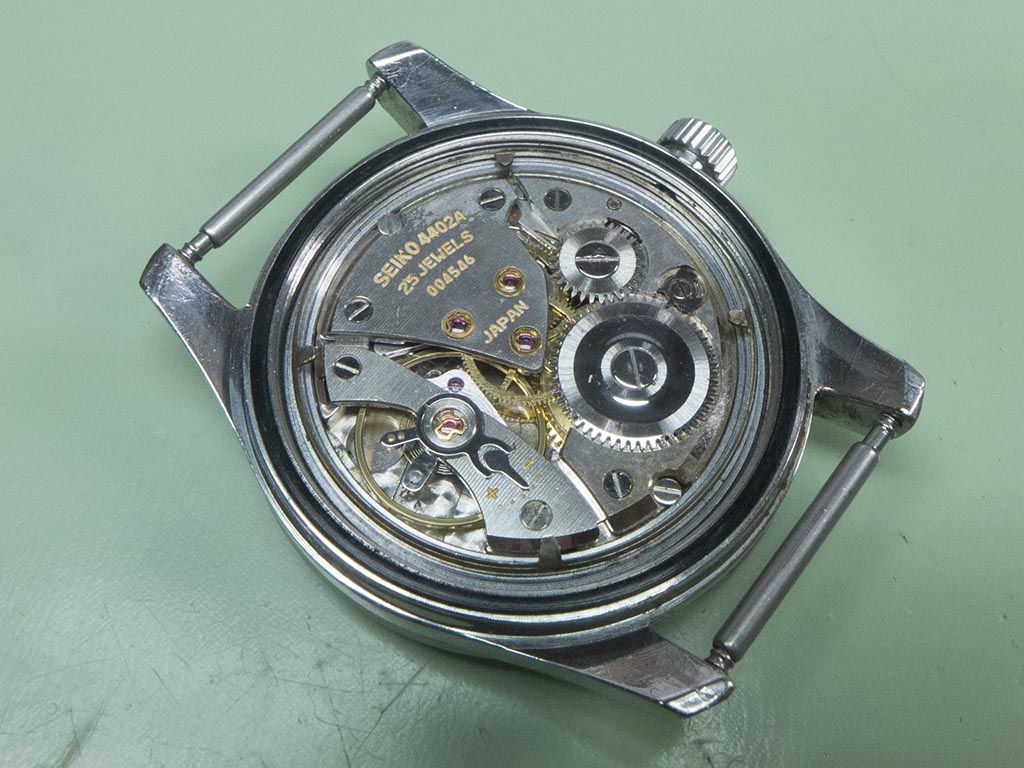 The caseback is engraved in the horseshoe style with a gold medallion in the centre. These medallions were found on various Grand and King Seikos and are made from a solid gold disc bonded to the stainless steel caseback. They featured a whole myriad of logos dependant on the watch they were destined for, from the lion of the Grand Seikos, right through to the plain Seiko and Daini symbol seen here.