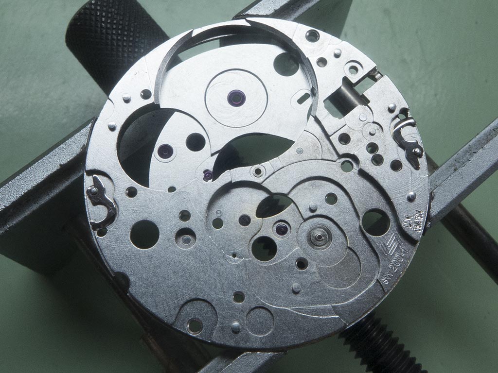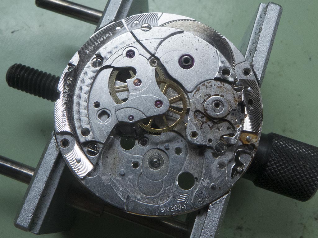 With the caseback removed things started to go downhill fast, you can see there are a lot of particles on the movement. This is powered by a decorated Silleta 200.1, a very capable ETA 2824 clone.