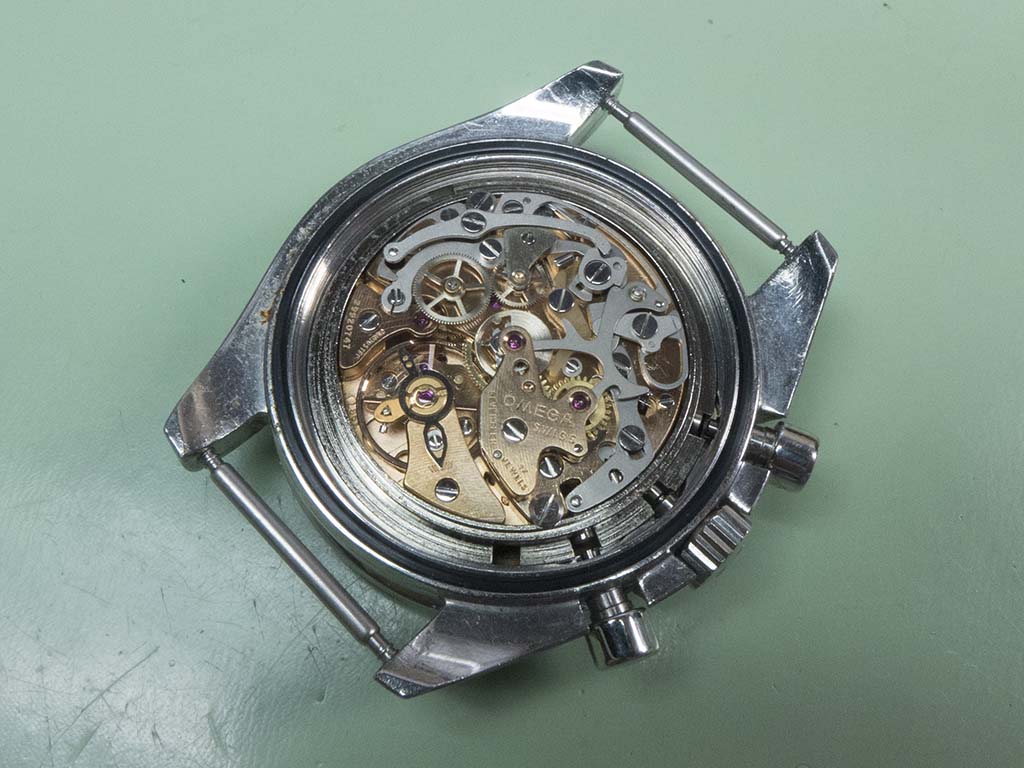 Omegas Speedmaster watches have to be one of the most iconic chronographs that have ever been made. From it’s introduction in 1957 to the present day the design has changed very little, an original CK2913 speedy is still undoubtably related to every model that came later. The movement changed throughout the years starting with the column wheel calibre 321, in 1968 the cam lever calibre 861 was introduced and in 1977 some small modifications were made and it became the calibre 1861. In more modern times movements based on the F. Piguet 33xx and the Omega calibre 9300 have been utilised. Of course the Speedmaster shot to fame with NASA choosing it as their official watch certified for space flight in 1965, and it was taken to the moon on a number of occasions. This fact is celebrated on the back of Speedmasters produced since then with the legend ‘First Watch Worn on the Moon’ engraved on the back. This 1977 example came in for a movement service, it was also suffering from a fluttering seconds hand and chrono creep on the hour register.