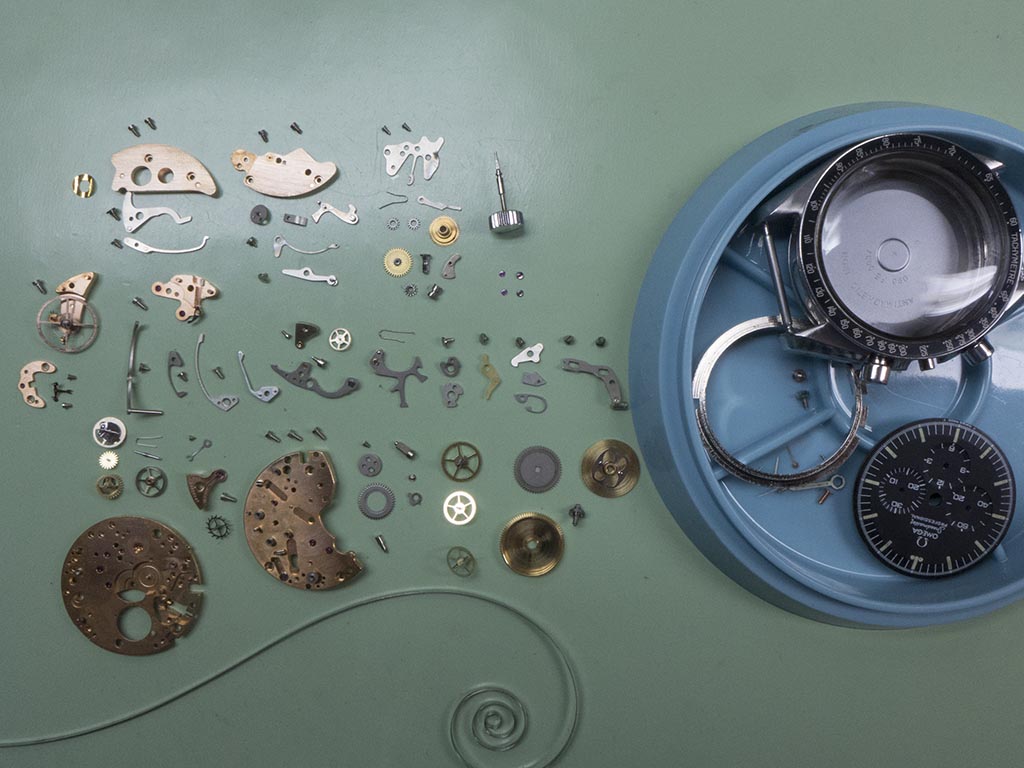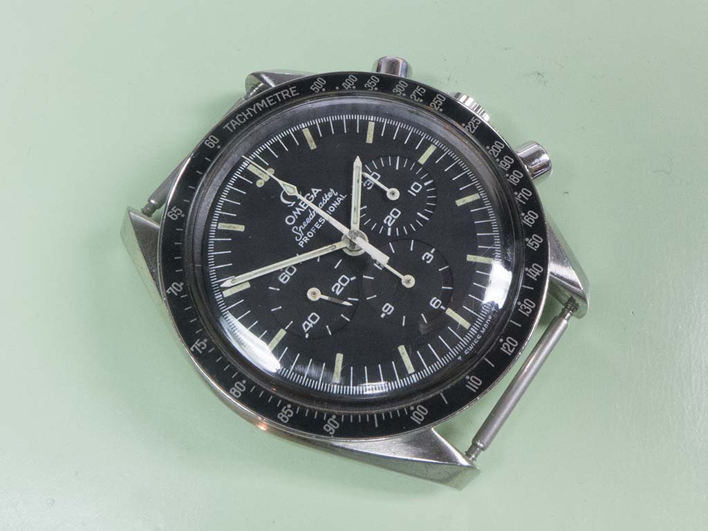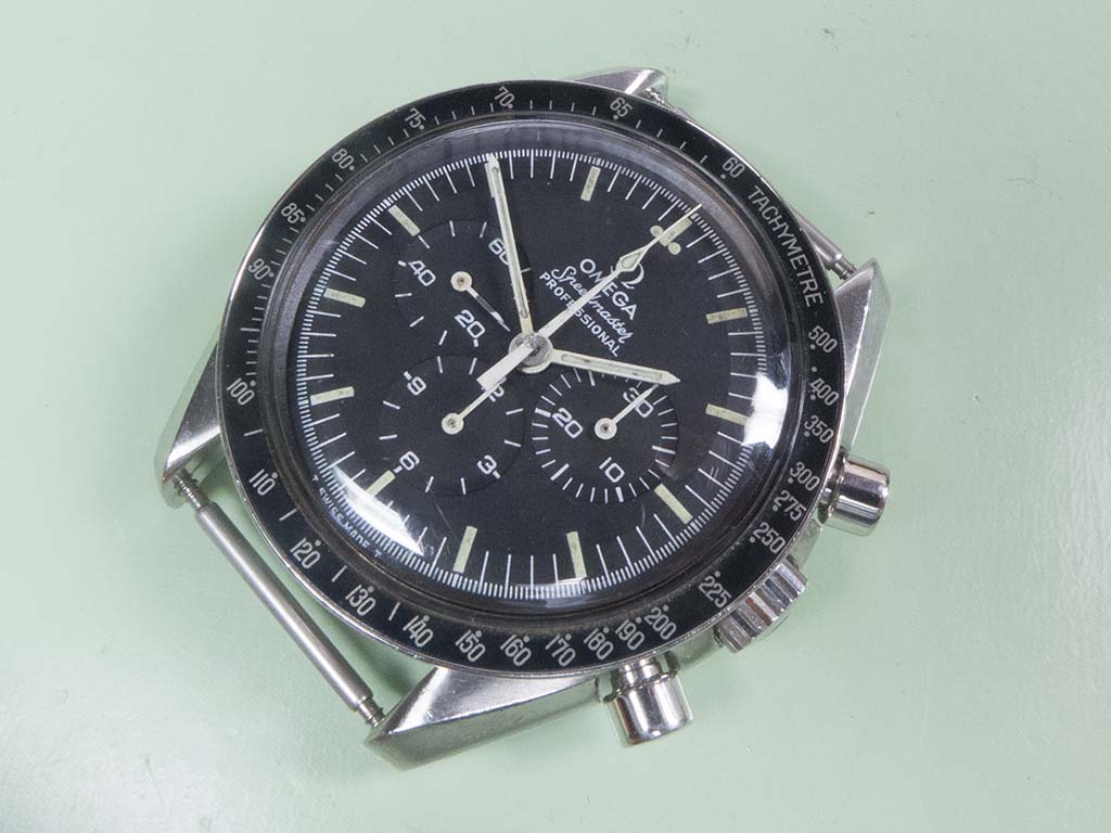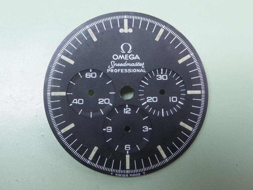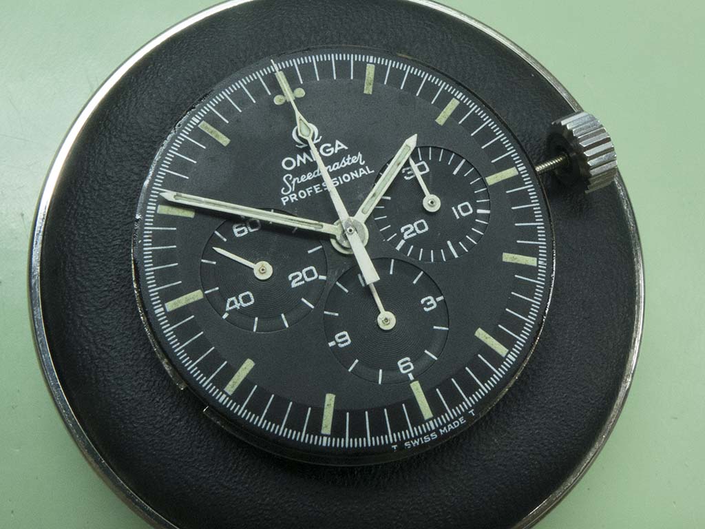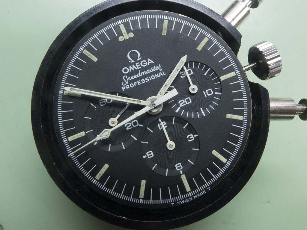 A shot of the classic Speedmaster dial and hands. The paint on the hands of this particular example was very fragile, you can see where it has been lost around the pinion area during previous services.