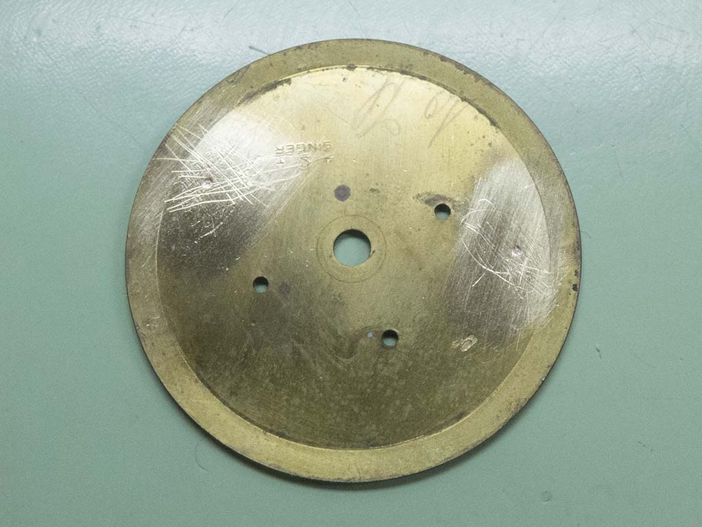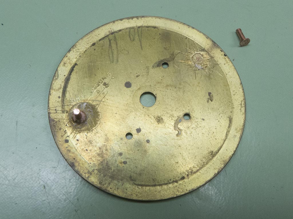 Whilst the movement was on test the dial was addressed. One problem that was apparent during removal was it was only attached by one dial foot. This was because both feet had been broken off and replacements had been glued in place, unfortunately this is never a permanent solution and inevitably one foot had broken off again.