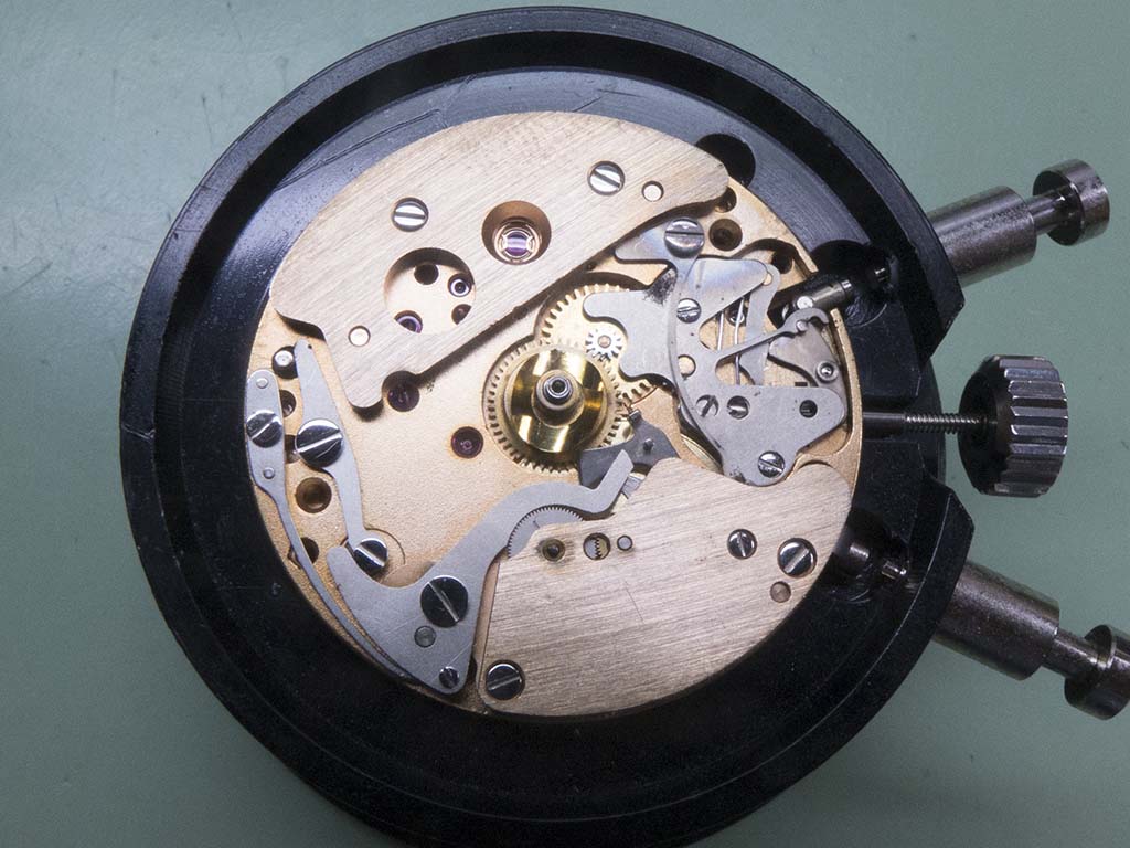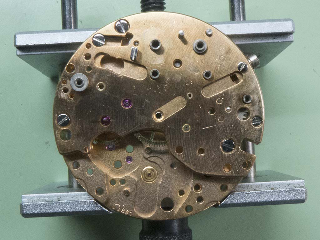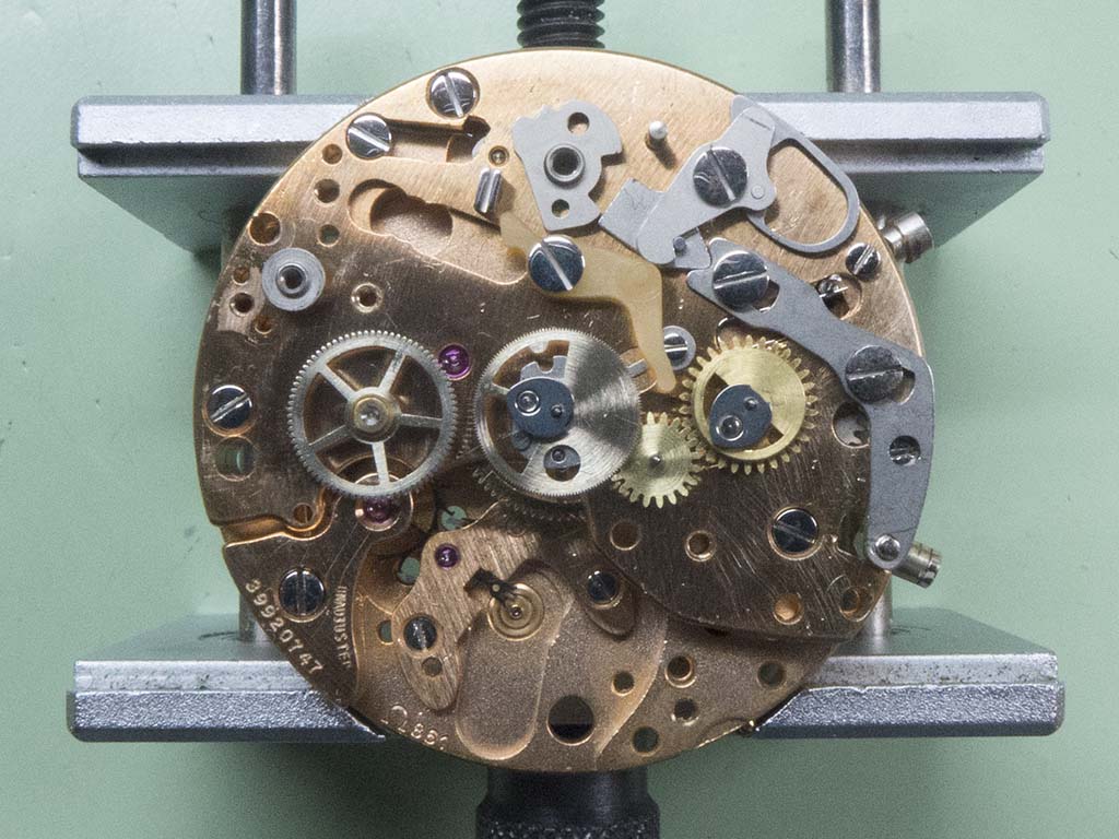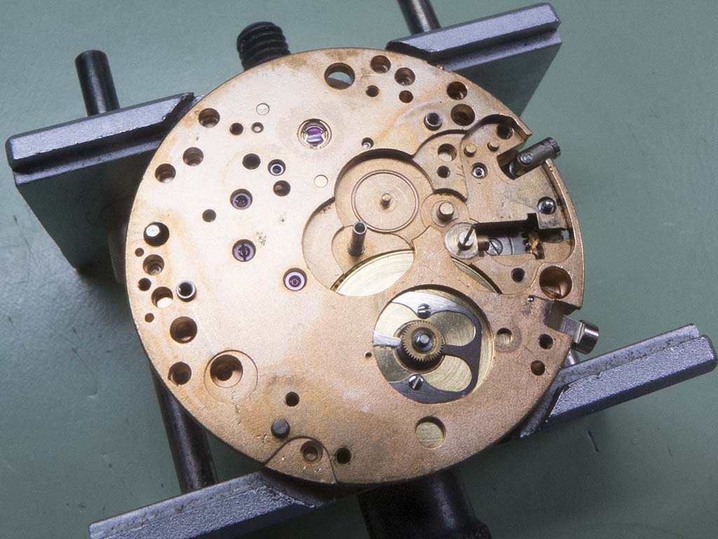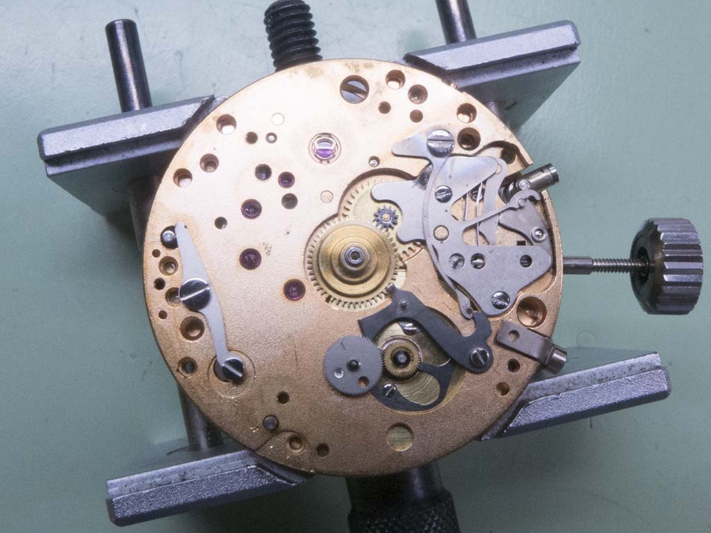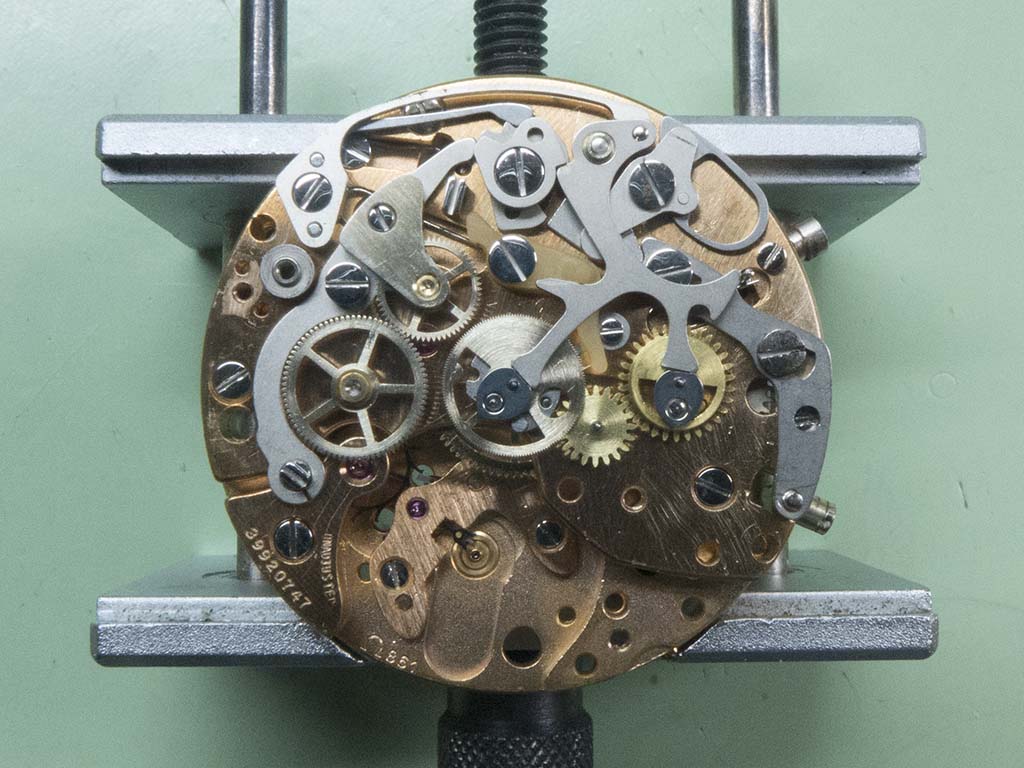 Turning the watch over work started on the motion work side, to reach it all the chrono levers and wheels have to be removed.