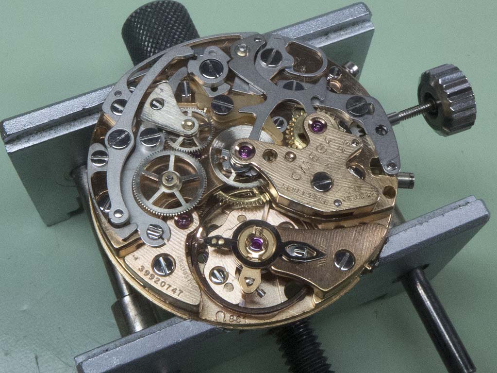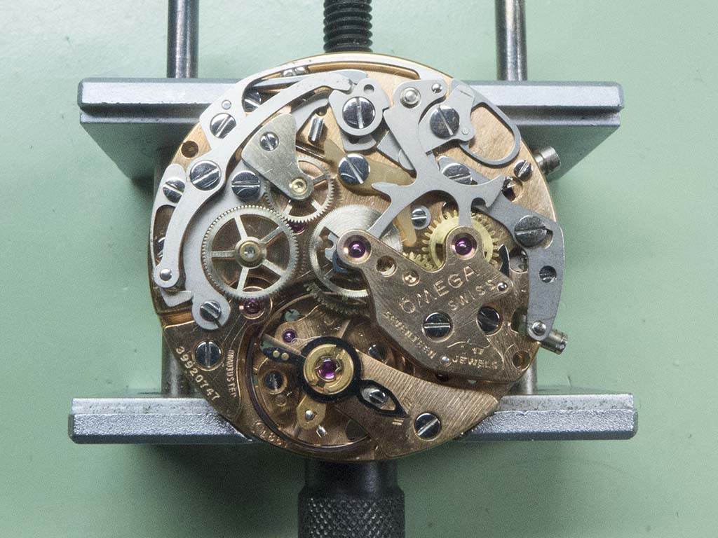 The dial side was rebuilt and the watch was then left to run, this is to check that the adjustments to the hour recording wheel operation has addressed the chrono creep. Handily Omega mark the wheel for this very purpose.