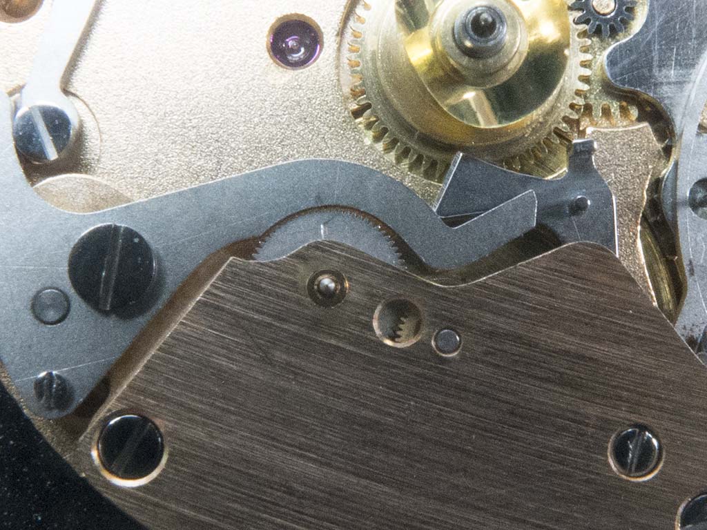 Underneath the dial is the keyless work and the reset and brake for the hour recorder.