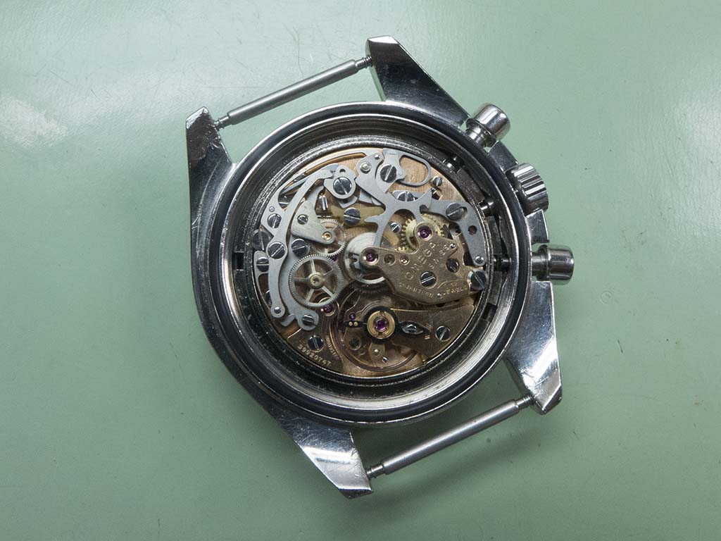 After it was verified that the chrono creep was sorted the dial and hands were refitted. As mentioned previously the paint bond on the hands was very weak and the sub seconds hand actually had a crack in the paint before it was removed. I managed to remove the hand very gingerly in one piece but when it was refitted the inevitable happened and the loose section of paint flaked off. Unfortunately no matter what precautions are taken and no matter how delicately you address problems, things like this can happen with vintage watches! It was decided to preserve originality and leave it as is, a decision I fully endorse. Whilst the movement was still uncased the chrono seconds hand was checked to ensure the flutter had been addressed correctly.