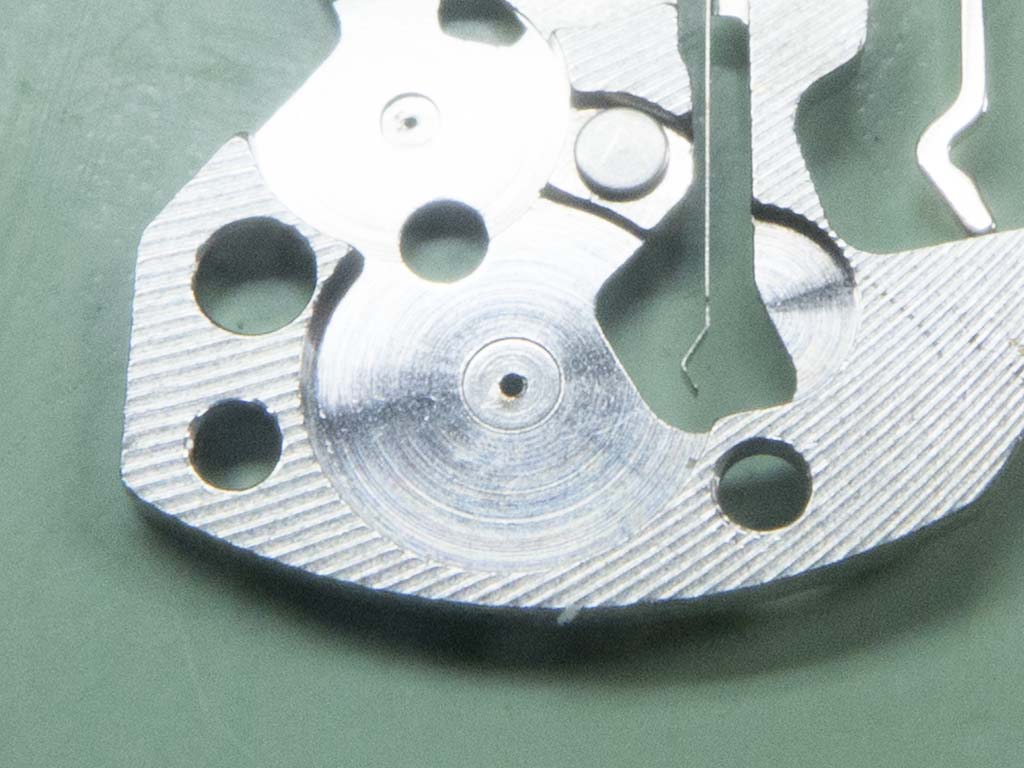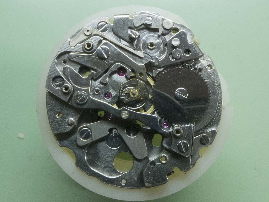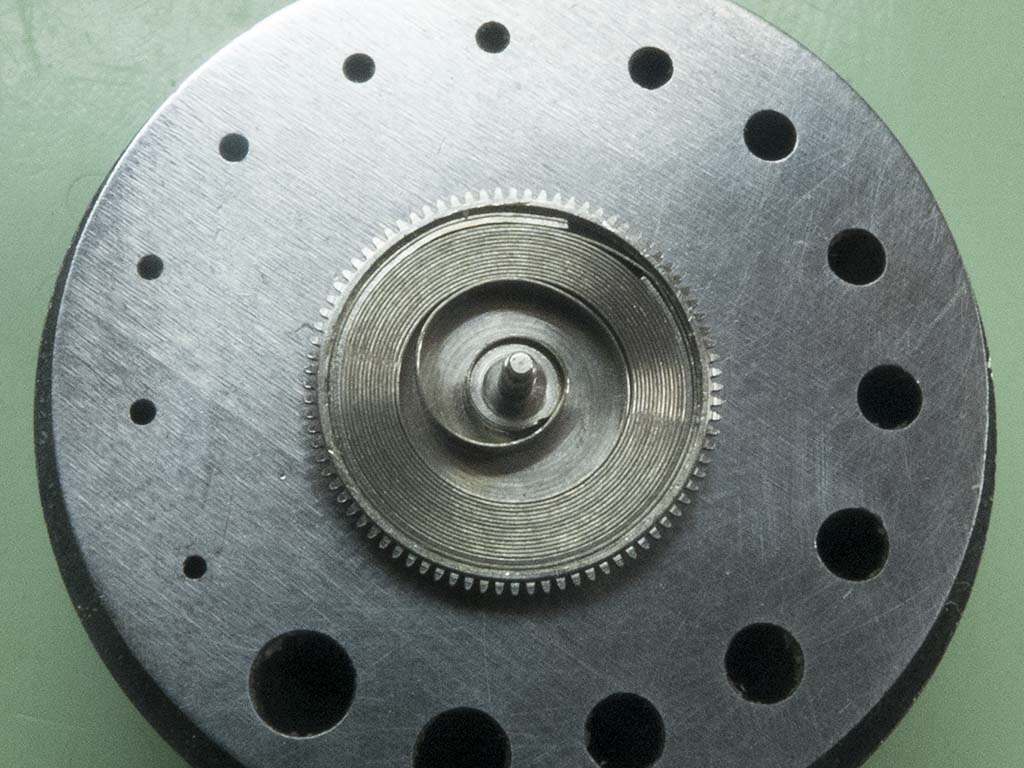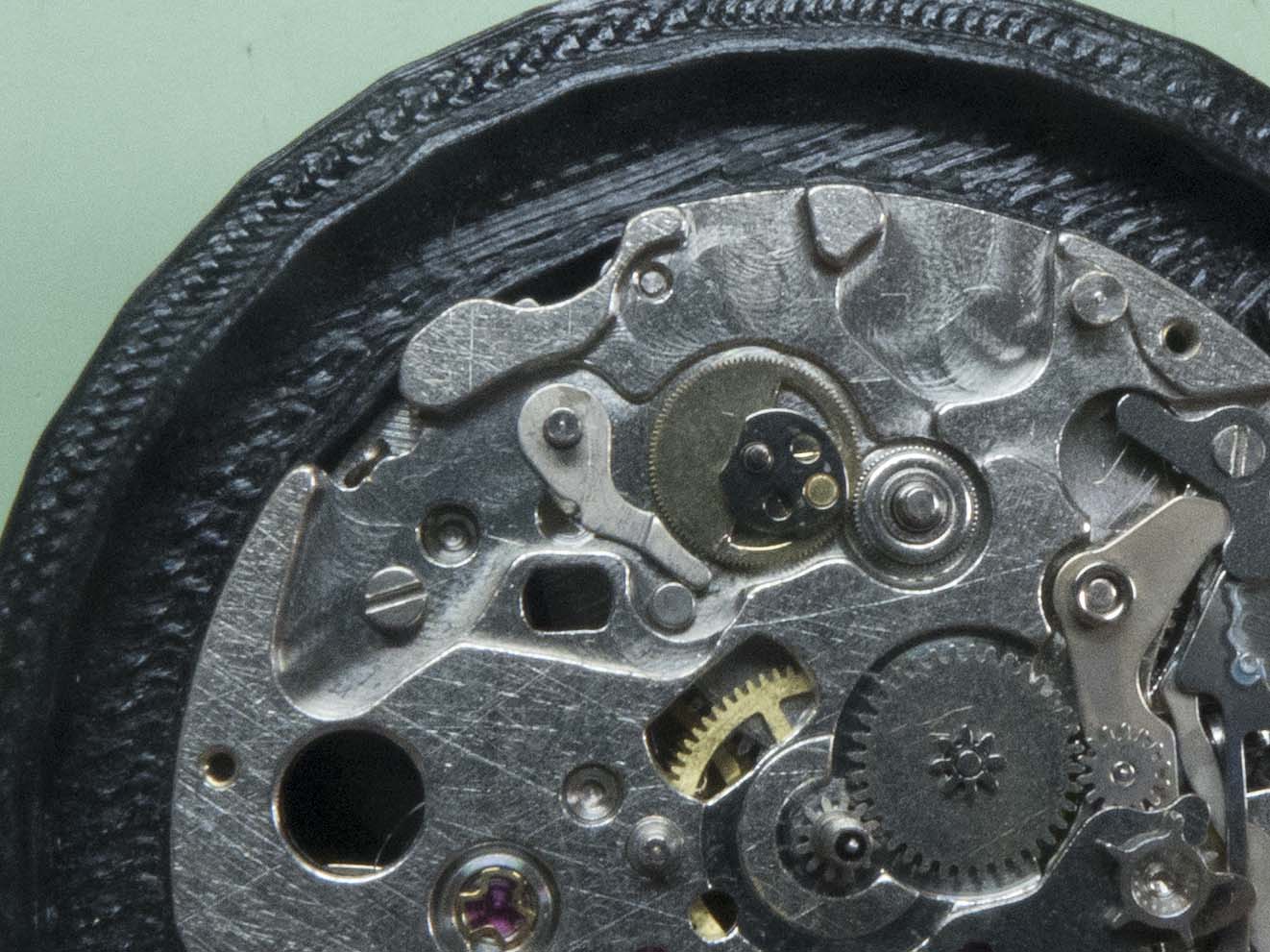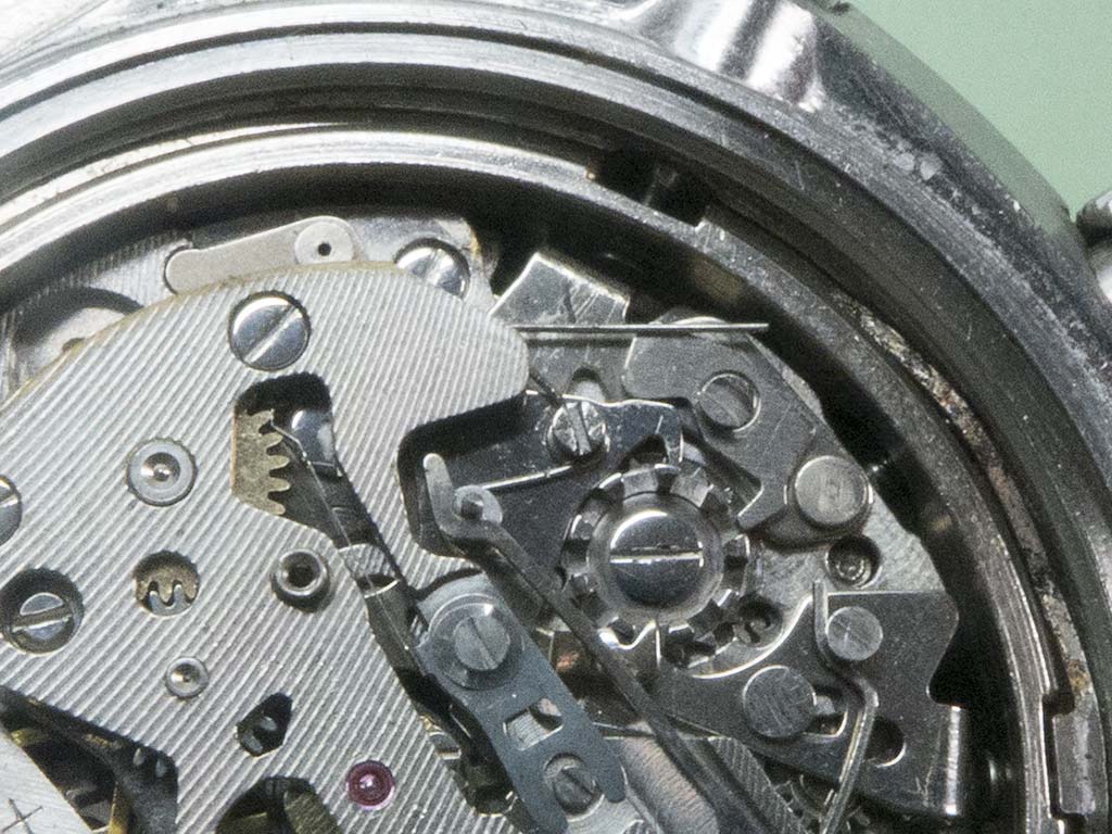 In this shot you can see the correct position of the hour recording wheels stop lever. The damage on the wheels teeth has also been dressed.