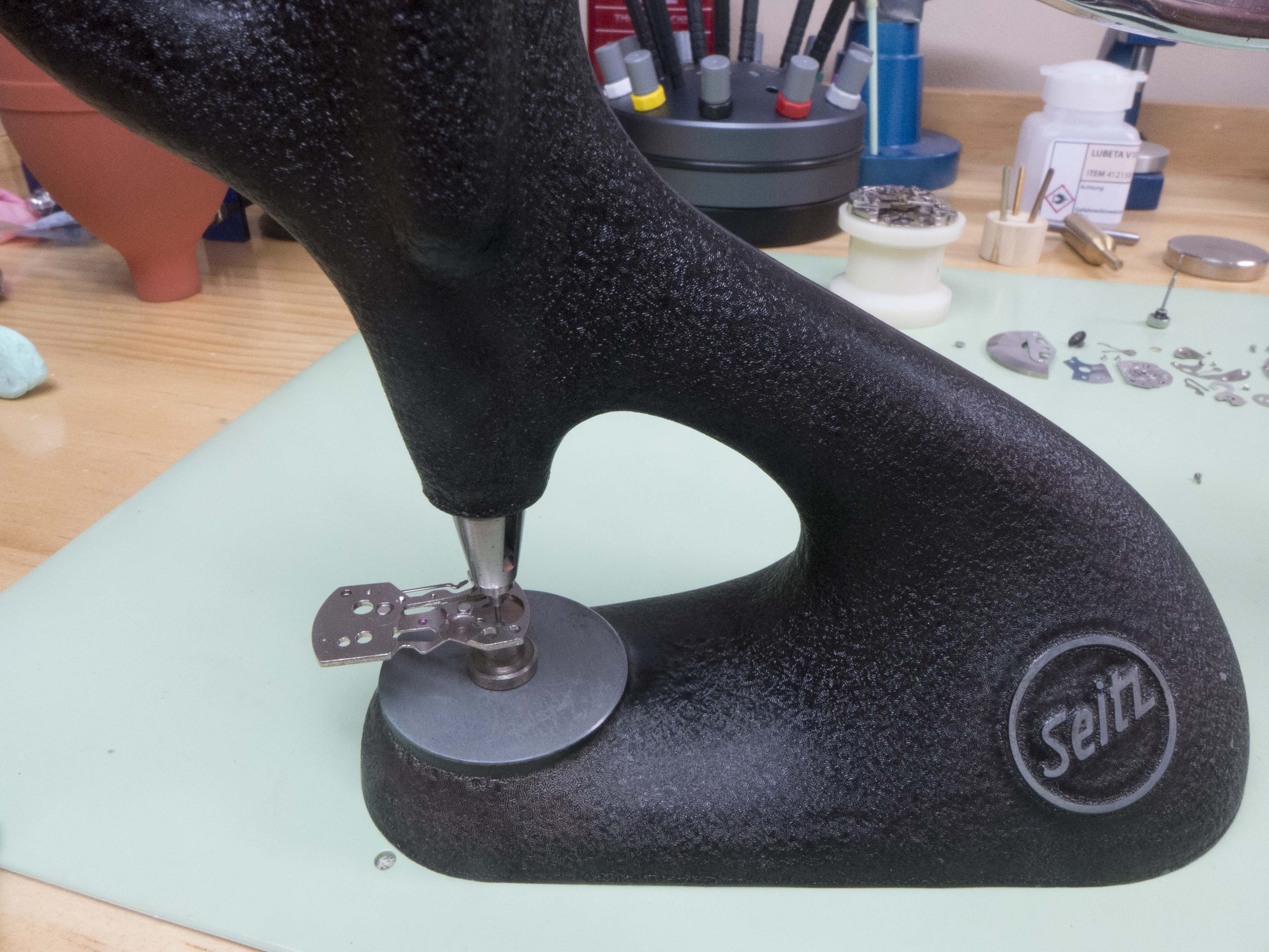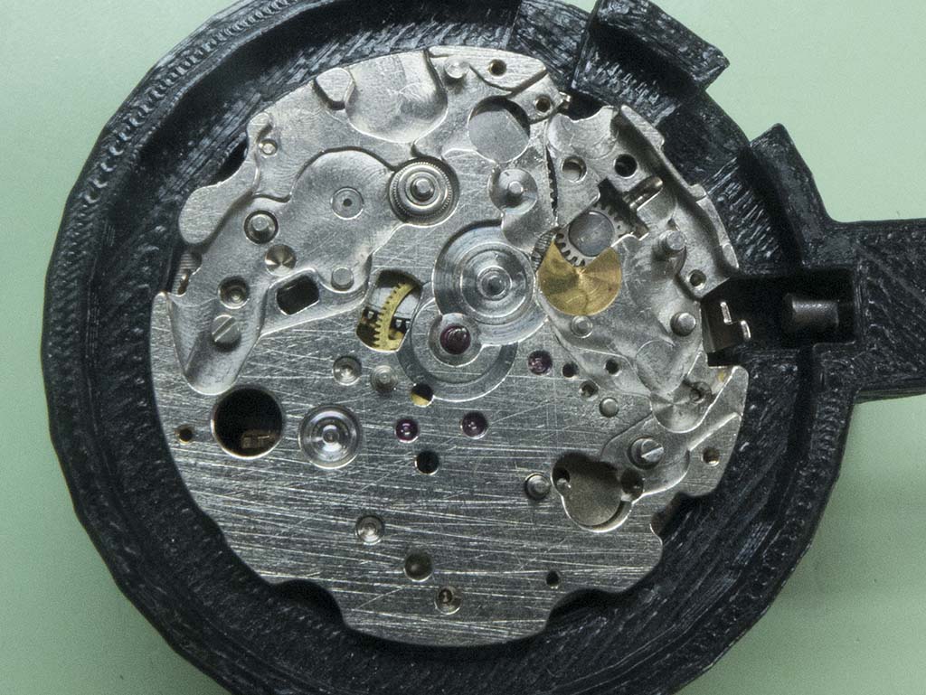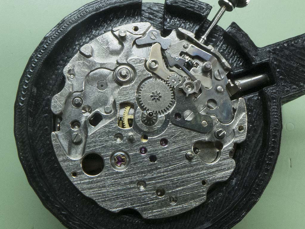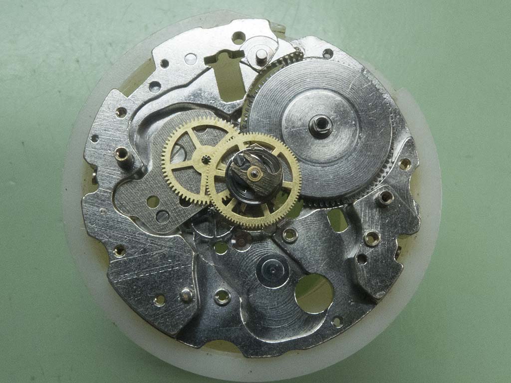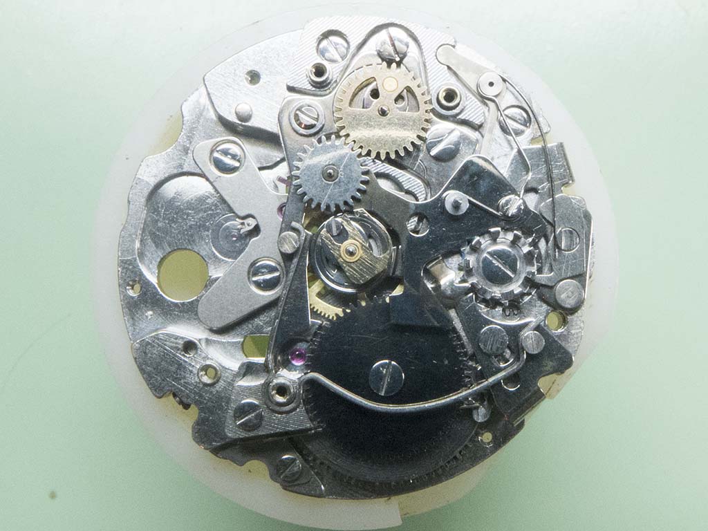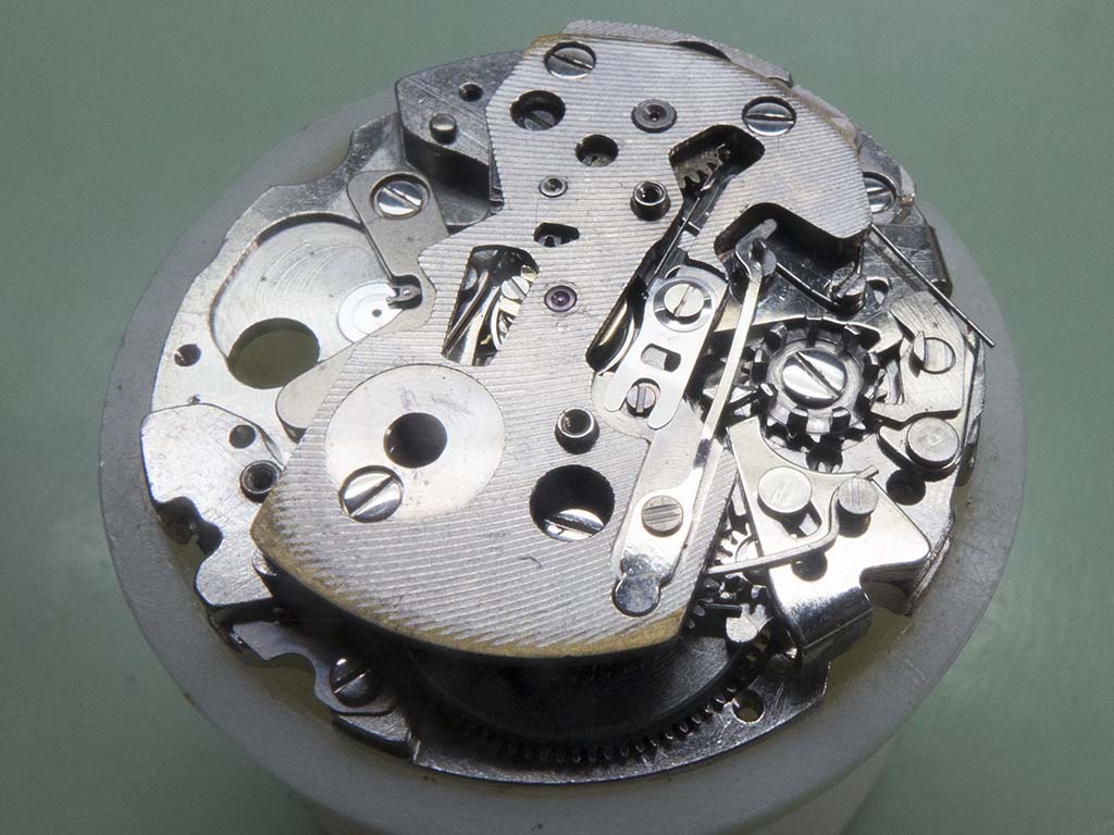 In this shot you can see the correct position of the hour recording wheels stop lever. The damage on the wheels teeth has also been dressed.