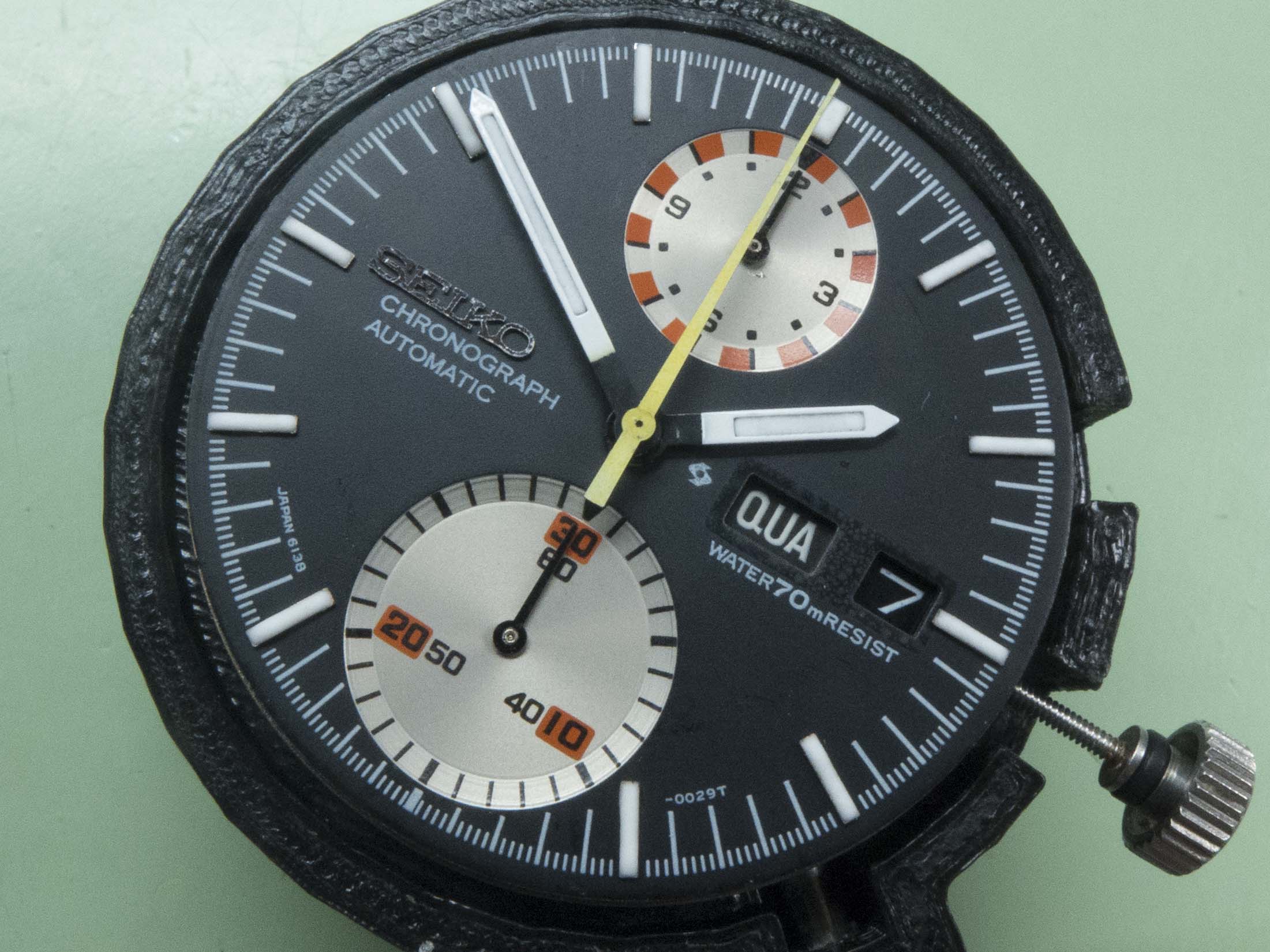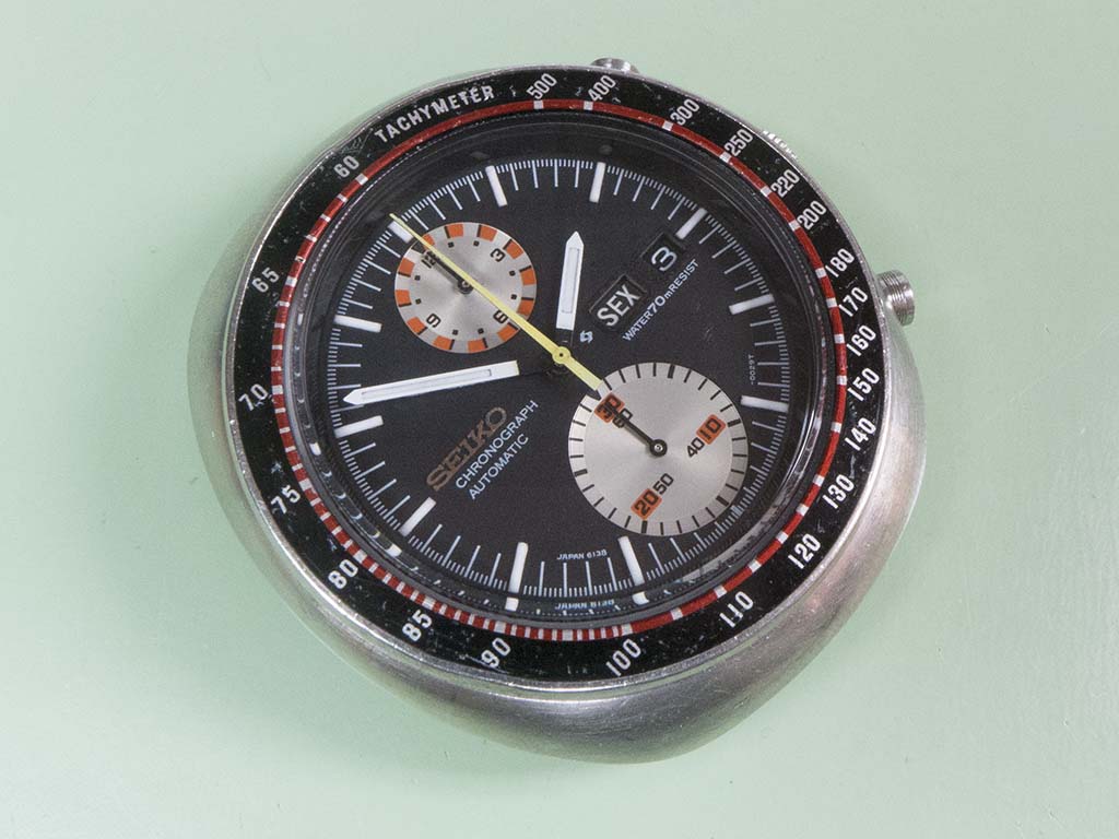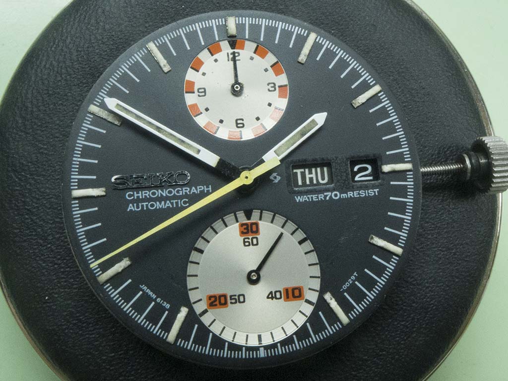During the late 1960’s the race to develop the worlds first automatic chronograph had two main contenders, the Zenith-Movado group and a joint effort from Breitling, Hamilton/Bren, Heuer/Leonidas and Dubois-Dpraz. Meanwhile Seiko had quietly been developing the calibre 6138 automatic twin register chrono which was planned to be the first to market and pip the Swiss to the post. Seiko quickly realised the technical challenges of the 6138 wouldn’t be overcome in time to release it as soon as they’d like, so they also developed the 6139 single register automatic chronograph alongside it which neatly side stepped the challenge of getting the hour register chronograph layer sandwiched between the motion work and the calendar components. Because of this decision, in February 1969 the first 6139’s were released to market which pipped Breitling groups calibre 11 official launch on March 3rd. The 6138 challenges were overcome and it was released the following year in 1970. The example featured here is a 6138-0011 more commonly know as the ‘UFO’ although it was originally advertised by Seiko as the ‘Yachtman’. This came in for a movement service and to correct a number of faults amongst which were a chronograph that wouldn’t run for more than 30 seconds and a minute register that reset everywhere but zero! It also came with a number of parts and a replacement case and crystal.