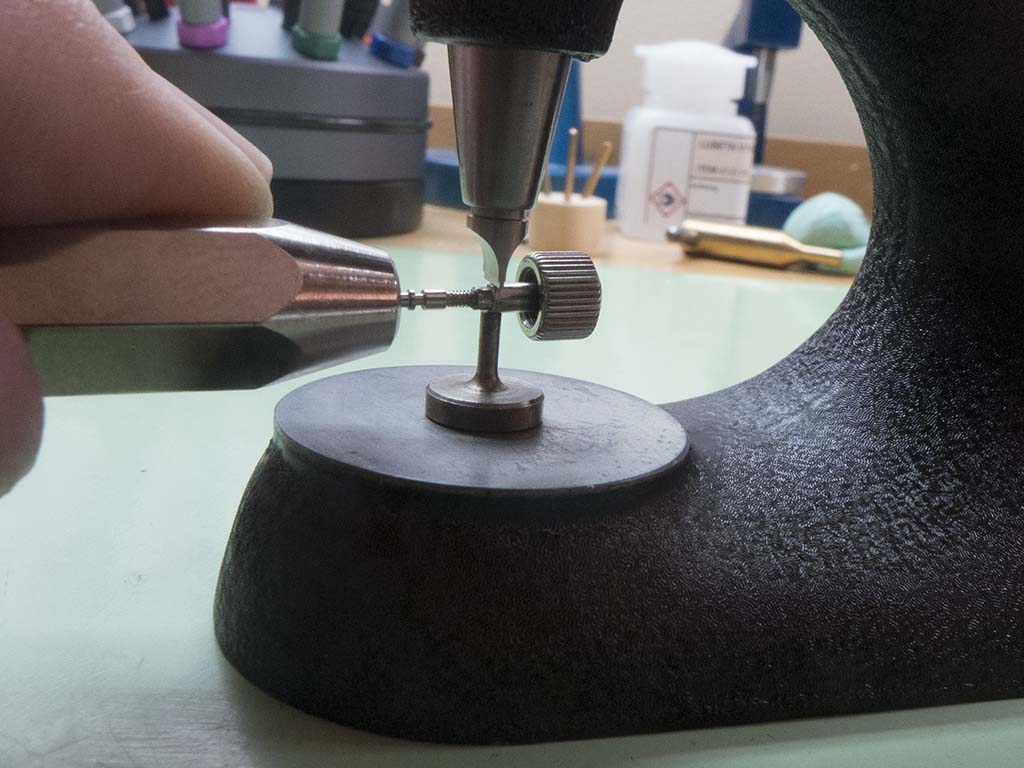 The end of the crown ‘tube’ had to be crimped back over the hexagonal end that was still attached to the stem so as to grip the it correctly to enable winding, date and time setting. When the crown is screwed home the hexagon joining section slides away from each other and the crown then disengages from the stem and spins freely to enable it to be screwed home without forcing a fully wound mainspring. To do this accurately I used my Seitz jewelling tool fitted with a flat anvil and a lanterning tool (for tightening canon pinions). This tool allowed the tube to be creased extremely accurately and prevented to much force being used or crimping the tube to deeply which would render the crown useless.
