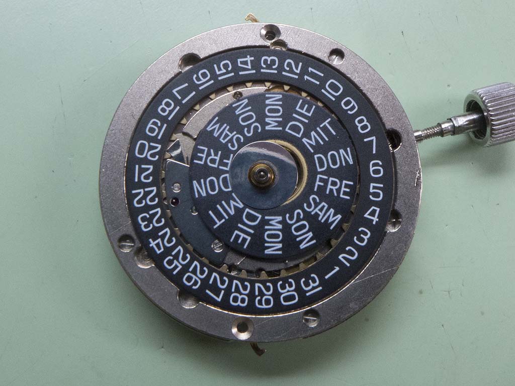 The crown and stem were refitted and it now works as it should, however there was one more problem and that was the day ring wasn’t advancing correctly or sitting centrally in the frame. As with most watches this means the dial and hands have to come off to access the components.