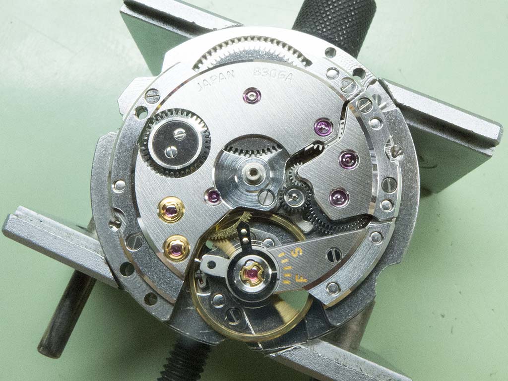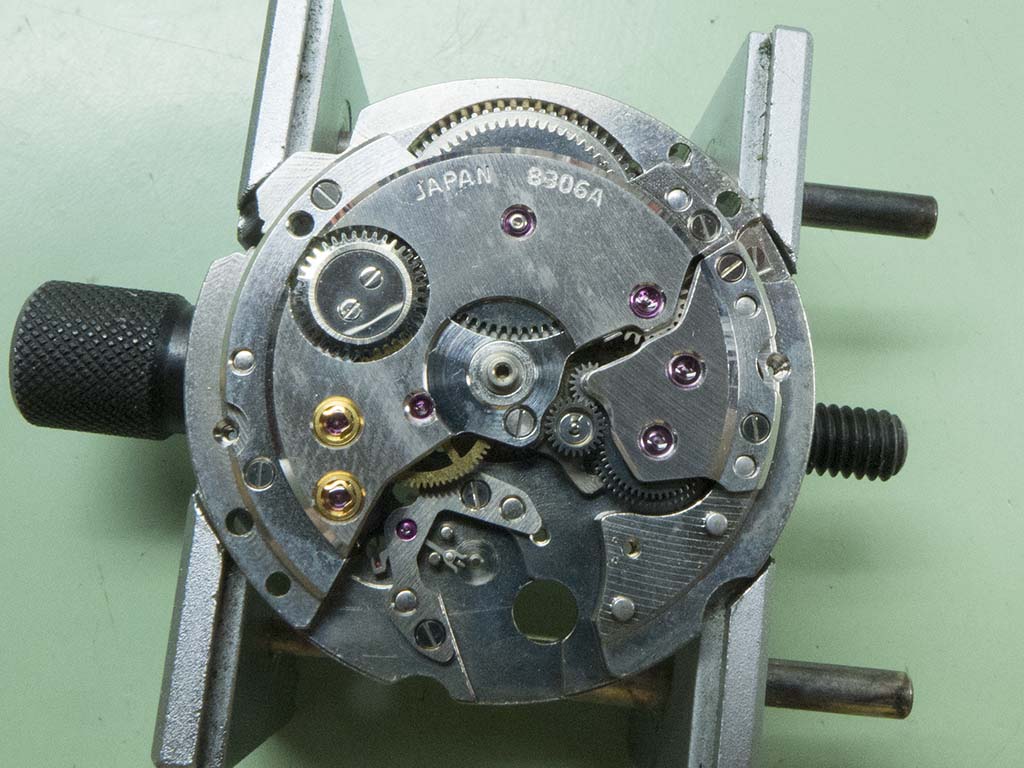 The autowind mechanism is refitted here. A word of warning about lubrication at this point, with Swiss watches (I’m referring to ETA here) the reverser wheel lubrication is critical, use the wrong stuff and it will cause you no end of problems very quickly. To this end I use a product called Lubeta v105 which is specifically designed for the lubrication of ETA reverser wheels. As the 8306 has a reverser wheel I lubricated it using Lubeta v105 and thought no more of it. After two days on test the watch stopped! On inspection nothing looked wrong with the autowind but when the rotor was spun it wouldn’t wind the barrel. I took the reverser back out, cleaned it again, lubricated it with synthetic oil this time, replaced it and the problem was solved. Lubeta leaves waxy deposits in the mechanism which is just what an ETA reverser wheel needs but in the Seiko version it actually keeps the fingers from engaging with the internal ratchet. Be warned if you ever service one of these!